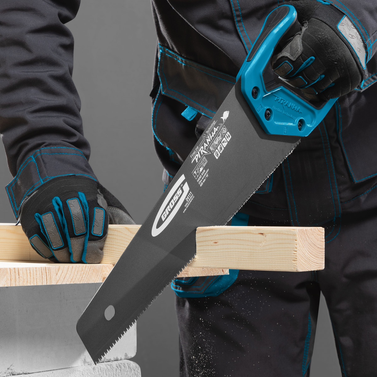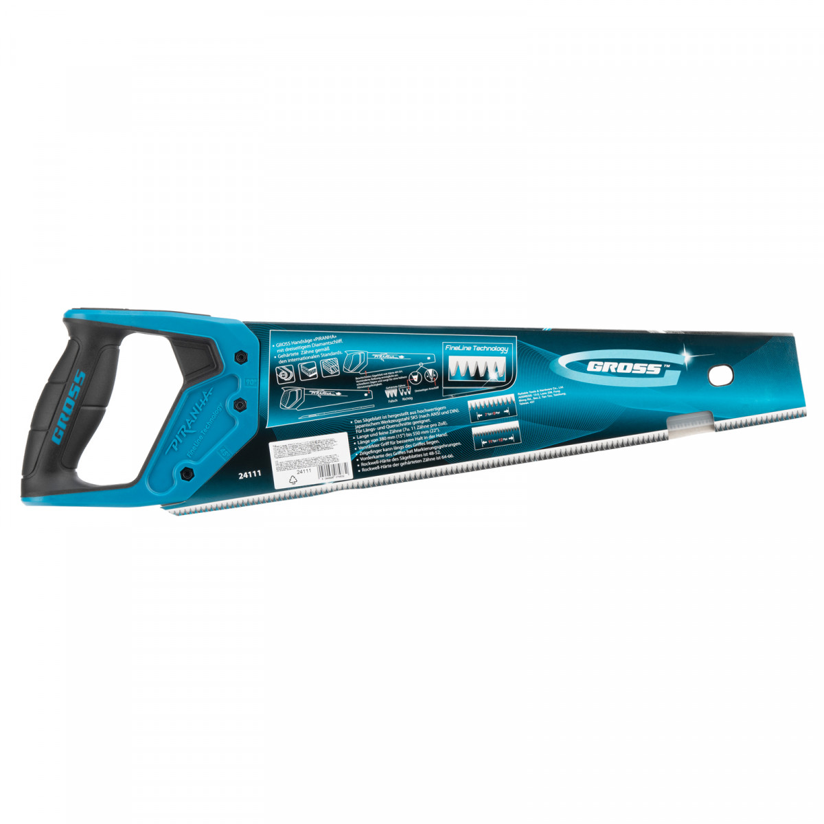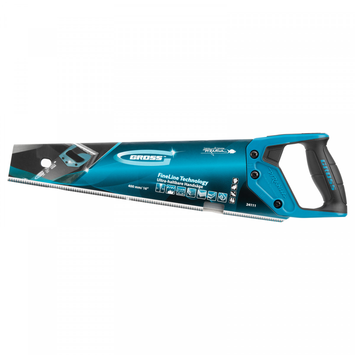 Ножовка по дереву Gross PIRANHA 24111 с полотном длиной 400 мм, калеными зубьями с 3D-заточкой и шагом 11-12 TPI, тефлоновым покрытием полотна и 2-компонентной рукояткой, используется для продольного и поперечного распиливания древесины различных пород, МДФ, ДСП, ДВП, ламината, а также пенополистирола, полиуретана и других синтетических материалов. Рабочая часть состоит из мелких зубьев с шагом 2-2,3 мм, что позволяет получить ровный и чистый рез. Трехгранная заточка зубьев увеличивает производительность инструмента без потери качества распиловки. Ножовка предназначена для столярных работ.