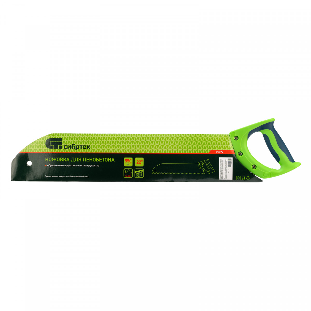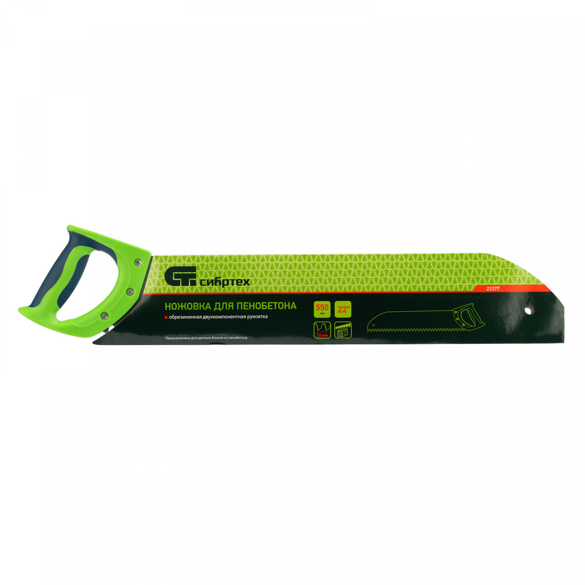 Ножовка Сибртех 23377 с полотном длиной 550 мм, с двухкомпонентной рукояткой, используется для распиливания небольших блоков из пенобетона. Высокая эффективность работы достигается благодаря крупным зубьям с шагом 16 мм и двухгранной заточкой. Ножовка применяется во время строительных работ.