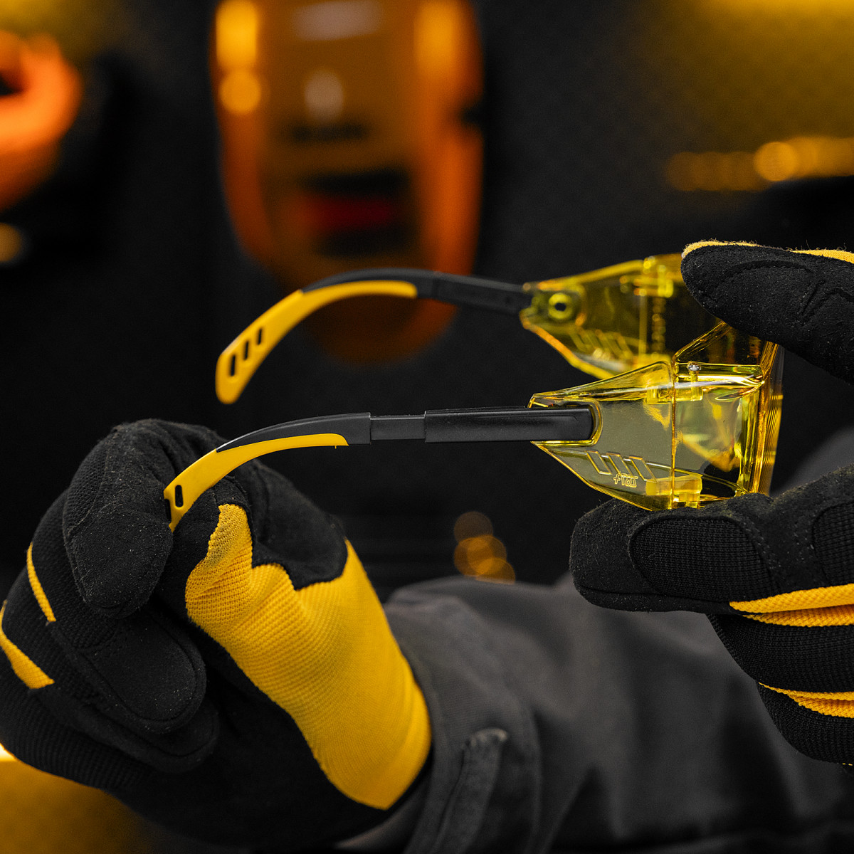 • Продуманная конструкция — особая форма линз обеспечивает боковую и надбровную защиту, а также позволяет носить защитные очки вместе с коррригирующими.