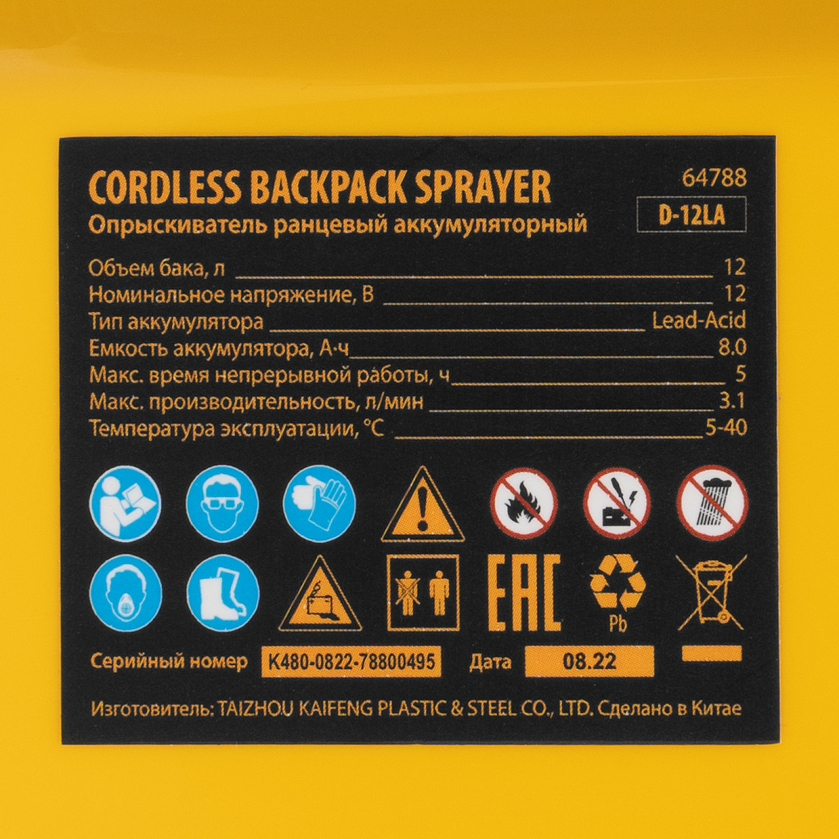 Опрыскиватель ранцевый аккумуляторный D-12LA, 12 л, 12 В, 8 Ач Denzel