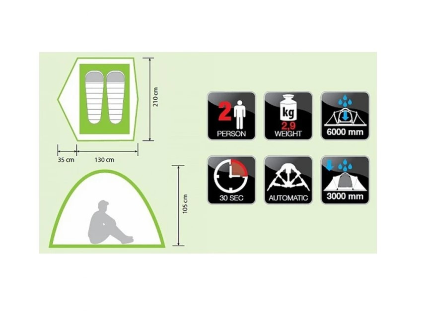 Внутренняя палатка и тент устанавливаются одновременно. Установка палатки может быть совершена одним человек за секунды.