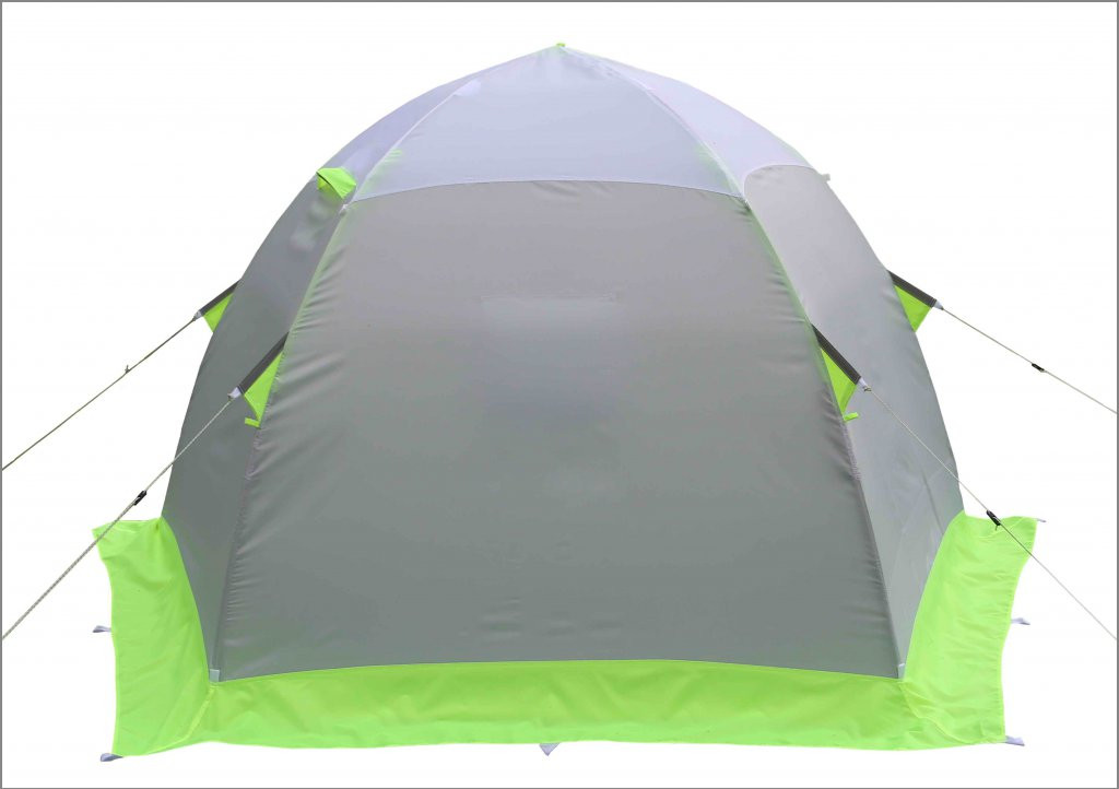 Тент палатки изготовлен из современных высокотехнологичных тканей с водонепроницаемым покрытием, обеспечивающих надежную защиту от атмосферных осадков, сильного ветра и мороза.