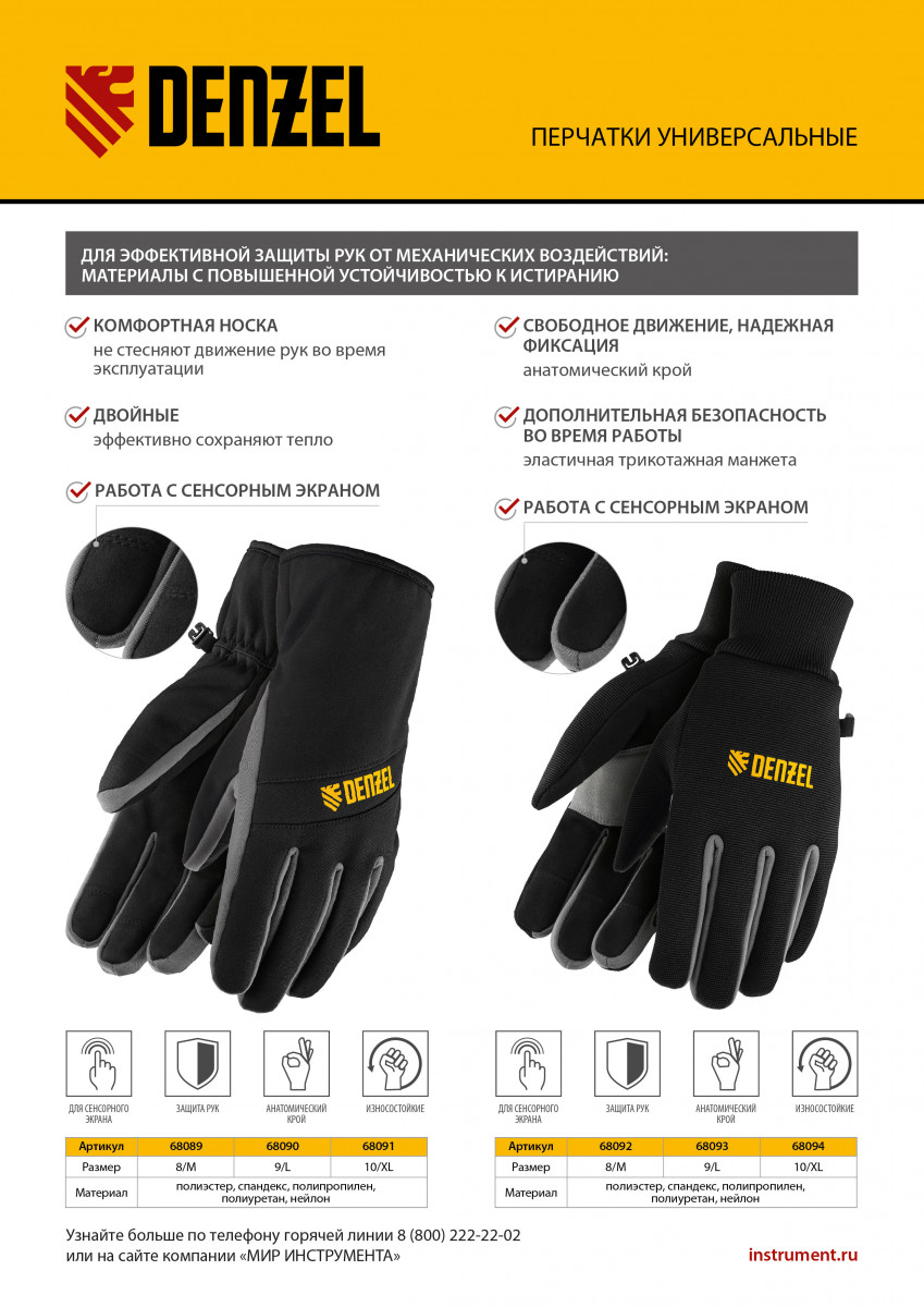 Универсальные двойные перчатки Denzel 68091 размера 10 защищают руки от механических воздействий и общепроизводственных загрязнений. Подходят для работы с сенсорным экраном — благодаря специальным накладкам на указательном и среднем пальцах можно не снимать перчатки, чтобы воспользоваться смартфоном. Перчатки пригодятся во время проведения строительных и ремонтных работ.