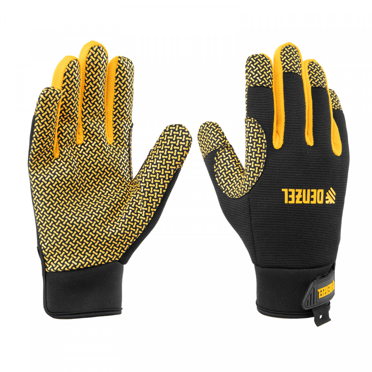 Универсальные перчатки Denzel 67999 размера 9, с силиконовым нанесением, предназначены для защиты кожи рук от механических повреждений. Используются во время слесарных и столярных работ.