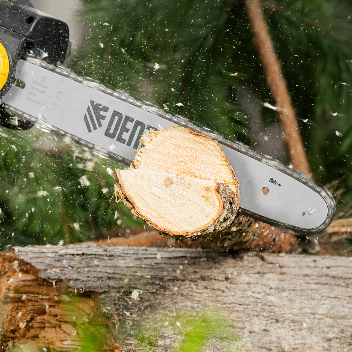 • Стальной зубчатый упор — электропила устойчиво фиксируется для распила бревен или деревьев, а мастер не устает и с легкостью может добиться аккуратной линии среза.