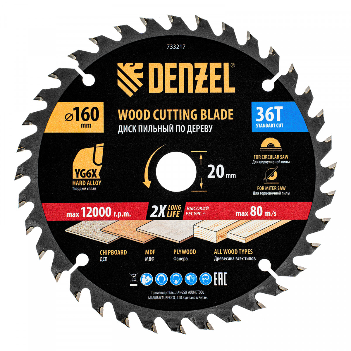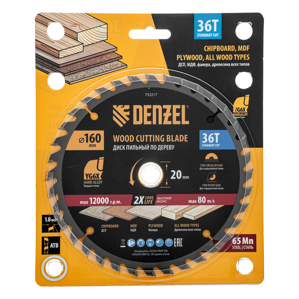 Пильный диск Denzel 733217 диаметром 160 x 20 мм, с 36 зубьями, предназначен для продольного и поперечного распила твердой и мягкой древесины, фанеры, МДФ, ДСП. 36 зубьев типа ATB с режущими пластинами оптимальной геометрии обеспечивают качественный рез. Тип реза — стандартный. Режущие пластины из твердого сплава YG6X сохраняют рабочие свойства при интенсивном использовании. Диск устанавливается на циркулярную, торцовочную пилу или на распиловочный станок. В комплект поставки входит переходное кольцо с 20 на 16 мм, что позволяет изменить посадочный размер и расширяет возможности использования диска.