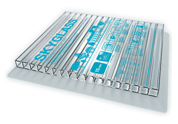 Сотовый поликарбонат SKYGLASS — представляет марку, отличающуюся оптимальным соотношением цены и качества, с защитой от UV-излучения 30 мкм.