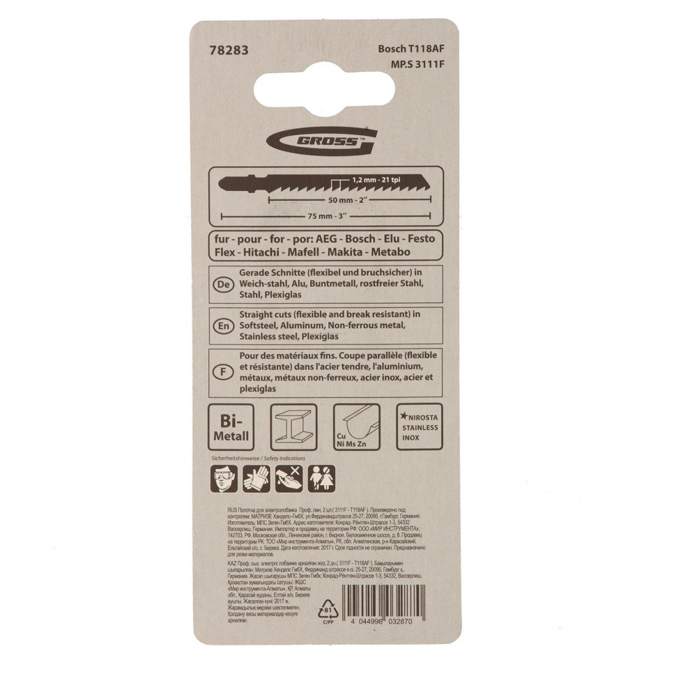 Полотна для электролобзика Gross Profi 78283, 2 шт. (3111F - T118AF), рассчитаны на пильные работы по металлу. Полотна высокого качества относятся к профессиональному классу инструмента. За счет длины 100 мм и толщины 1,27 мм они могут распиливать заготовки толщиной 1,5-3 мм.