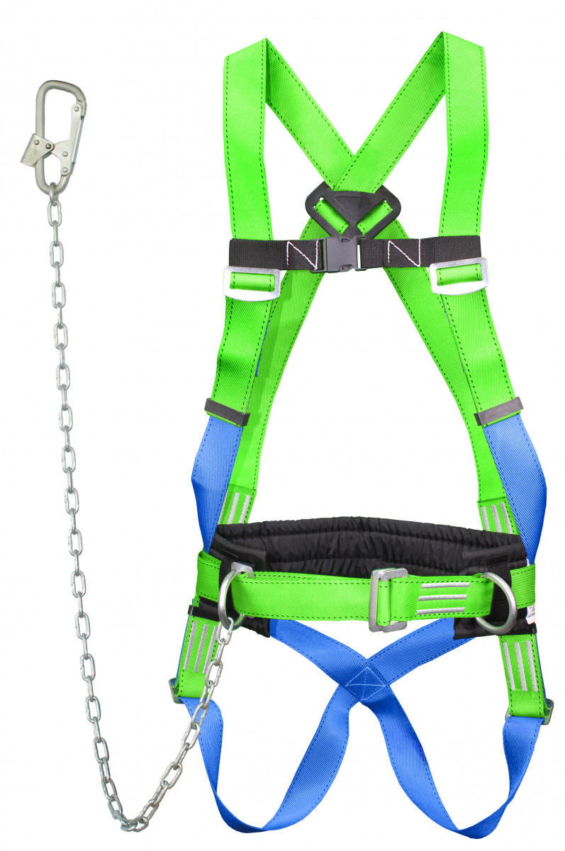 Включает в себя ремень с пряжкой (позволяет подгонять пояс по фигуре человека), подкладку под ремень (кушак), наплечные и набедренными лямки, элементы крепления – два металлические D-кольца на ремне привязи и одно на спине, строп из металлической цепи с монтажным карабином (4 типа карабинов), бирку, выполненную в соответствии с ГОСТ Р ЕН 365, паспорт-инструкцию с отметкой ОТК и гарантией производителя (закреплен под биркой на кушаке).Величина обхвата талии, обеспечиваемая ремнем, мм: 840-1500
