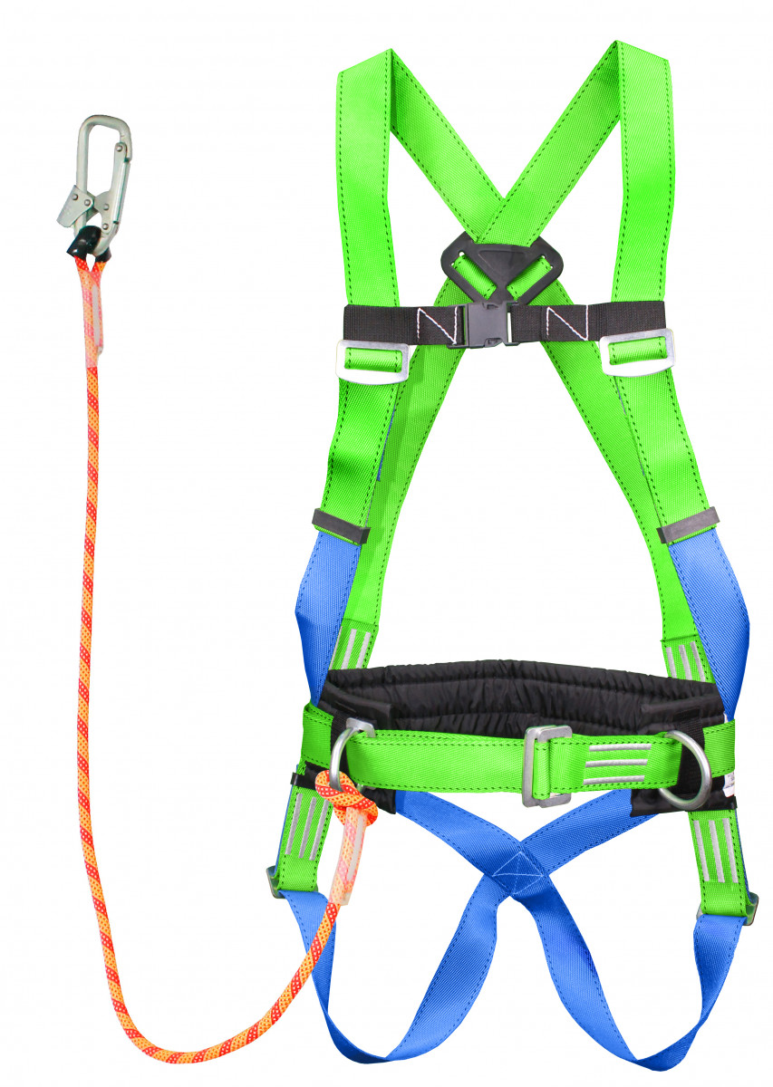 Включает в себя ремень с пряжкой (позволяет подгонять пояс по фигуре человека), подкладку под ремень (кушак), наплечные и набедренными лямки, элементы крепления – два металлические D-кольца на ремне привязи и одно на спине, строп из полиамидного каната с монтажным карабином (4 типа карабинов), бирку, выполненную в соответствии с ГОСТ Р ЕН 365, паспорт-инструкцию с отметкой ОТК и гарантией производителя (закреплен под биркой на кушаке).