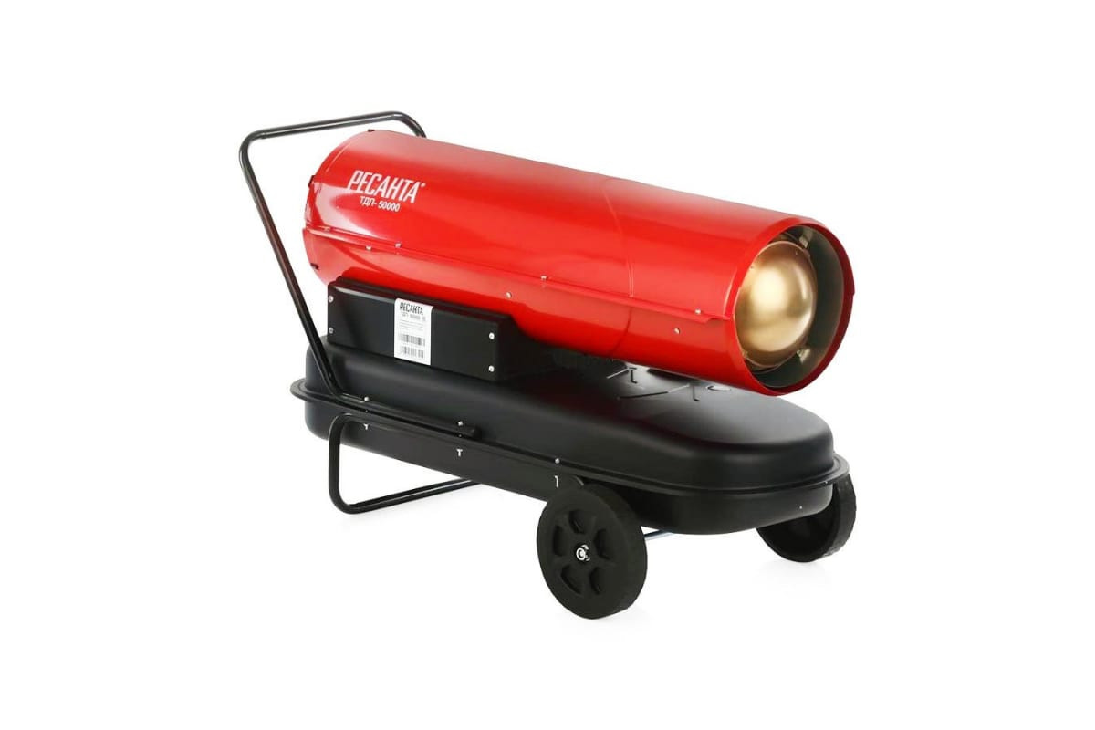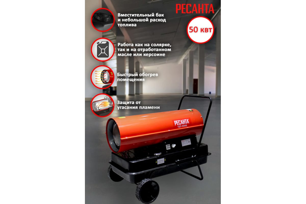 Ресанта ТДП-50000 — производительный обогревательный прибор для нежилых и проветриваемых помещений: складов, гаражей, мастерских, строительных площадок. Устройство имеет понятную систему подключения, быстро нагревается и экономично расходует топливо. Дизельная теплопушка мощностью 50 кВт работает от сети 220-230В. Оснащена резервуаром емкостью 56 л. Производительности 1500 м³/час и расхода дизеля или керосина 3,96 кг/ч достаточно для непрерывного обогрева неотапливаемой площади в течение 12 часов.