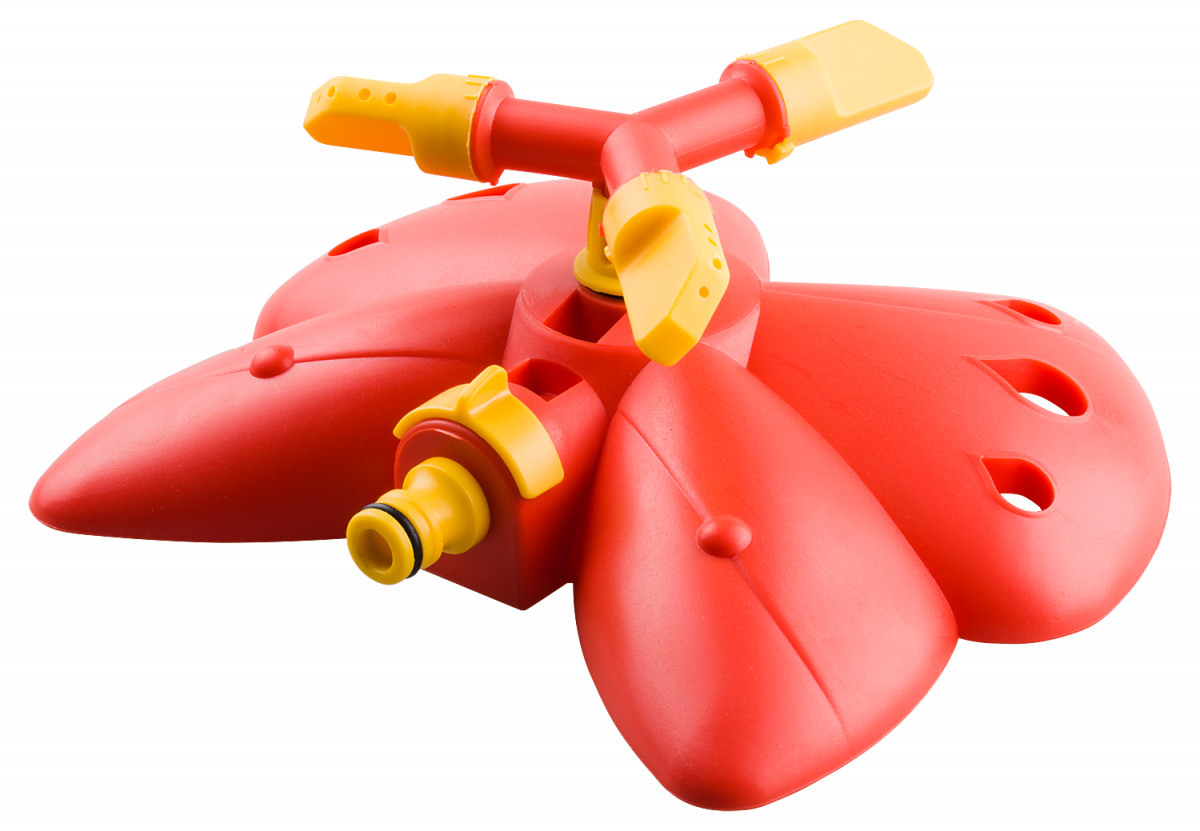 Распылитель используется для стационарного полива растений. Выполнен в форме бабочки. Устойчивую фиксацию в почве обеспечивает пластиковая пика. Для удобного хранения она может быть закреплена внутри распылителя. Регулировка дальности полива обеспечивается путем поворота одного из 3 сопл распылителя. Корпус изготовлен из ударопрочного пластика. К шлангу подключается при помощи соединителя. Высококачественный материал является гарантией надежности, устойчивости к влаге и высокому давлению.Максимальная площадь полива, м2: 115.
