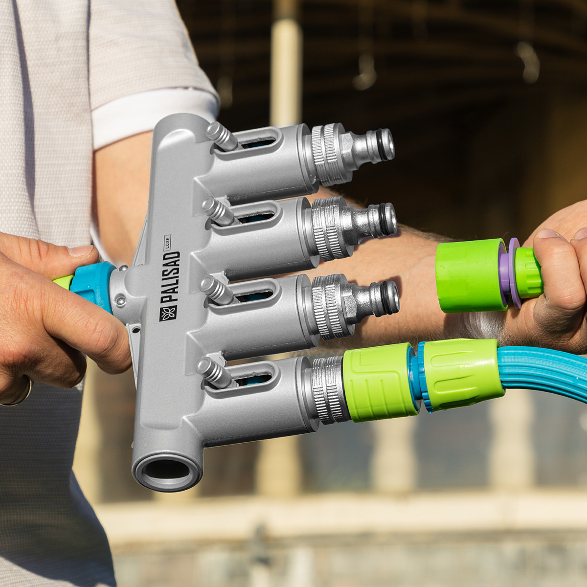 Четырехканальный штуцерный разветвитель Palisad LUXE 65833 с внутренней резьбой 3/4", из алюминия, предназначен для разделения водопроводной магистрали. Его устанавливают на магистральный отвод или резьбовой кран либо подключают к линии через адаптер. Соединяется со шлангами при помощи адаптеров. Поможет смонтировать надежную систему полива на дачном участке.