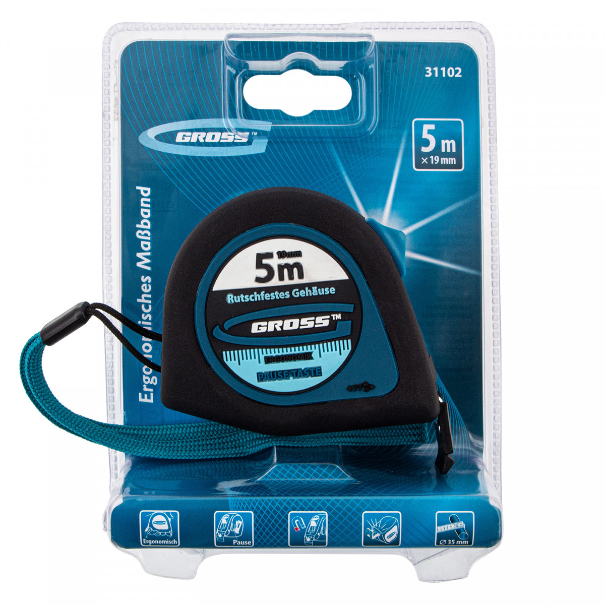 Рулетка "Ergonomisch",5 м x 19 мм,магнитный обрезиненный зацеп Gross