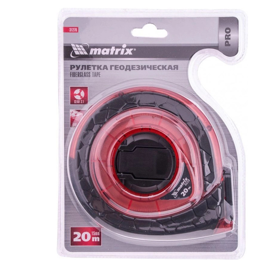 Геодезическая рулетка торговой марки MATRIX применяется при проведении замеров на строительных площадках, открытых участках, дорогах, а также при ландшафтных и геодезических работах. Планетарный механизм сматывания имеет передаточный коэффициент 3 к 1, что позволяет сматывать измерительную ленту в три раза быстрее по сравнению с рулетками, использующими обычный механизм. Рулетка оснащена фиберглассовым полотном. Корпус рулетки изготовлен из поликарбоната, который имеет высокие показатели прочности и ударной вязкости, со вставками из термопластичной резины.