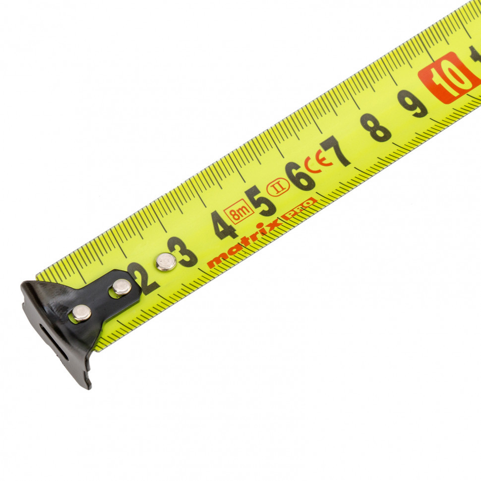 Рулетка Matrix PRO Neon 32593 в обрезиненном корпусе, с 3 механизмами фиксации ленты длиной 8 м и шириной 25 мм, служит для определения расстояний и размеров различных предметов. Крупные цифры на матовом желто-зеленом полотне хорошо видны, что облегчает считывание результатов. Измерительное полотно можно зафиксировать на нужной отметке при помощи стопора или одной из двух кнопок-пауз — это удобно при проведении большого количества замеров. Рулетка предназначена для выполнения профессиональных и бытовых измерительных работ.
