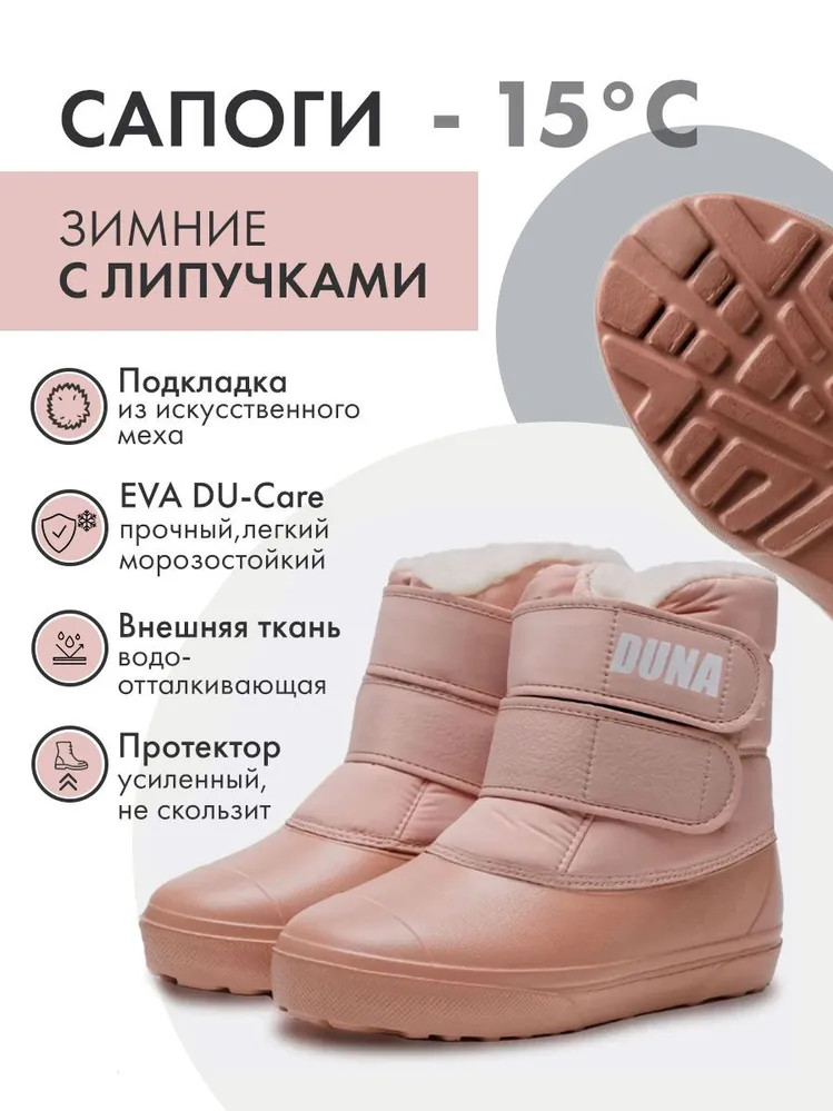 Технология: бесшовное монолитное литьё, прошивка тканевого верха Материал верха: оксфорд с водоотталкивающей пропиткой Материал подошвы: EVA DU-Care Материал подкладки: шерсть 30% Утеплитель: вшитый Состав: мех с натуральной шерстью, не менее 30% Температура эксплуатации до -15°С
