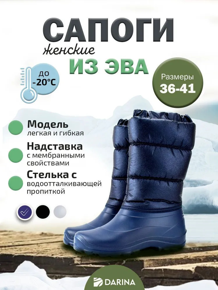 Женские сапоги из ЭВА Стужа — это практичная модель для повседневной носки. Изготовленные из легкого и гибкого материала ЭВА, эти сапоги подойдут тем, кто ценит простоту и удобство. Утеплитель из синтепона с искусственным мехом дарит дополнительное тепло в прохладную погоду. Стелька, выполненная из меха и водоотталкивающей ткани, обеспечивает вентиляцию и комфорт в течение всего дня. Верхняя часть сапог из ткани с металлическим эффектом имеет мембранные свойства, позволяющие ногам «дышать».