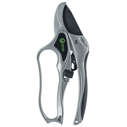 Контактный секатор с храповым механизмом предназначен для обрезки живой и сухой древесины. Максимальный диаметр реза – 30 мм. Особенность работы секатора – рез в три этапа. Вы делаете одно нажатие, затем ослабляете сжатие. Второе нажатие – ослабляете. Третье нажатие – финальный рез. При этом двигать или крутить секатор не нужно. Лезвие уже погрузилось в древесину и зафиксировалось в ней. Плавное поэтапное погружение гарантирует бережный и чистый рез. А так же снижает нагрузку на руку. Лезвия секатора изготовлены из японской стали SK5. Одной из важных характеристик этой стали является длительное сохранение режущей способности – лезвие будет долго оставаться острым. Antistick покрытие помогает легко избавиться от налипающих на сок растения остатков коры и листвы и обеспечивает легкий уход. Одна рукоятка с гардой – защищает пальцы от случайных ударов. Вторая – с покрытием термопластичной резиной (TPR) – не будет скользить в руке. Надежный фиксатор обеспечивает безопасность в закрытом положе