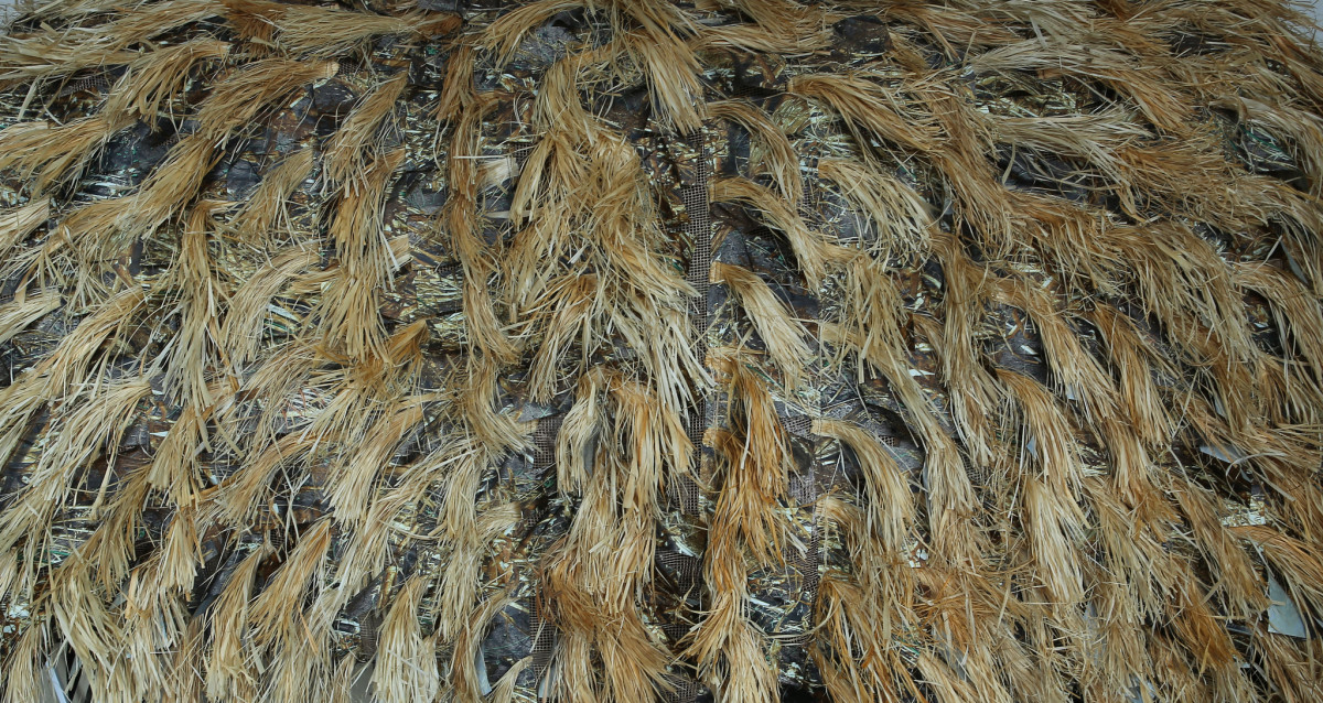 На сетку нашиты полоски камуфляжной ткани Таффета 210 (100% п/э) и большое количество пучков натурального липового лыка.