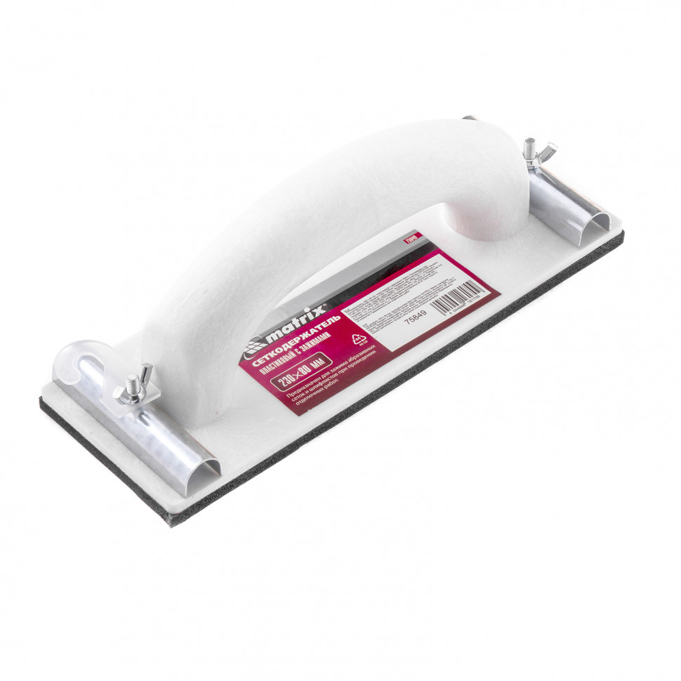 Пластиковый сеткодержатель Matrix 75849 с подошвой 230 х 80 мм, с зажимами, используется для ручного шлифования деревянных, шпатлеванных, металлических, пластмассовых и прочих твердых поверхностей. Сеткодержатель фиксирует абразивную стеклосетку или шлифлист и позволяет удалять старые отделочные покрытия, подготавливать поверхность под покраску, а также выполнять чистовую обработку.