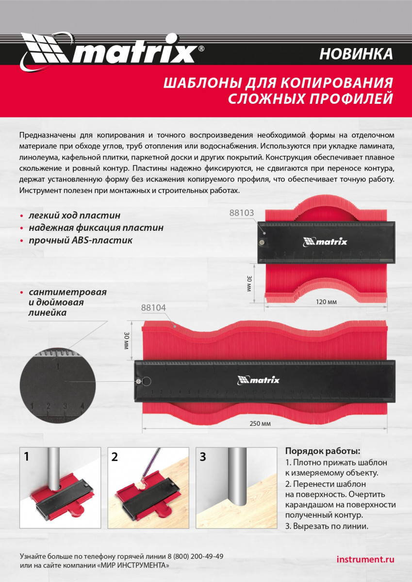 Пластиковый шаблон для копирования профиля Matrix 88104 предназначен для копирования и переноса контуров различных форм. Шаблон необходим для точной подрезки отделочных материалов (ламинат, линолеум, кафельная плитка, гипсокартон и др.) при обходе труб водоснабжения, углов и других рельефных препятствий. Перенос контуров осуществляется при помощи выдвижных пластиковых пластин. Шаблон оснащен измерительной шкалой длиной 25 см.