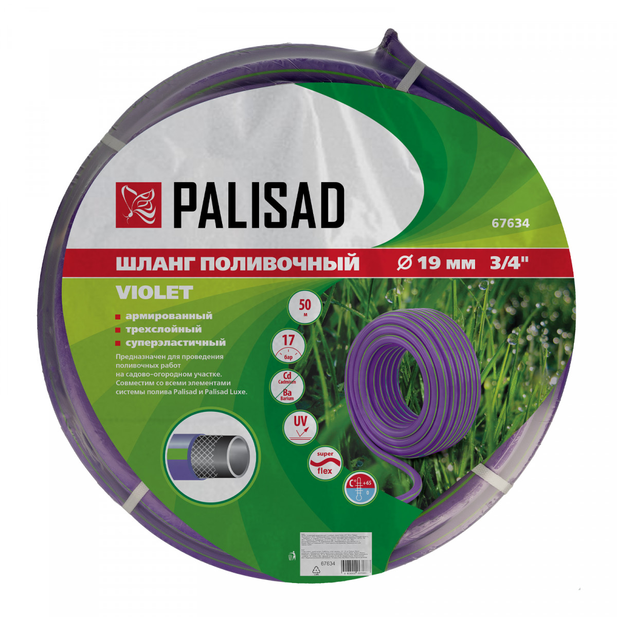 3-слойный армированный поливочный шланг Palisad 67634 серии Violet длиной 50 м и диаметром 3/4" применяется для организации ручного или автоматического орошения растений. Подходит для ежедневного интенсивного использования на даче, совместим со всеми поливочными системами Palisad и Palisad LUXE.