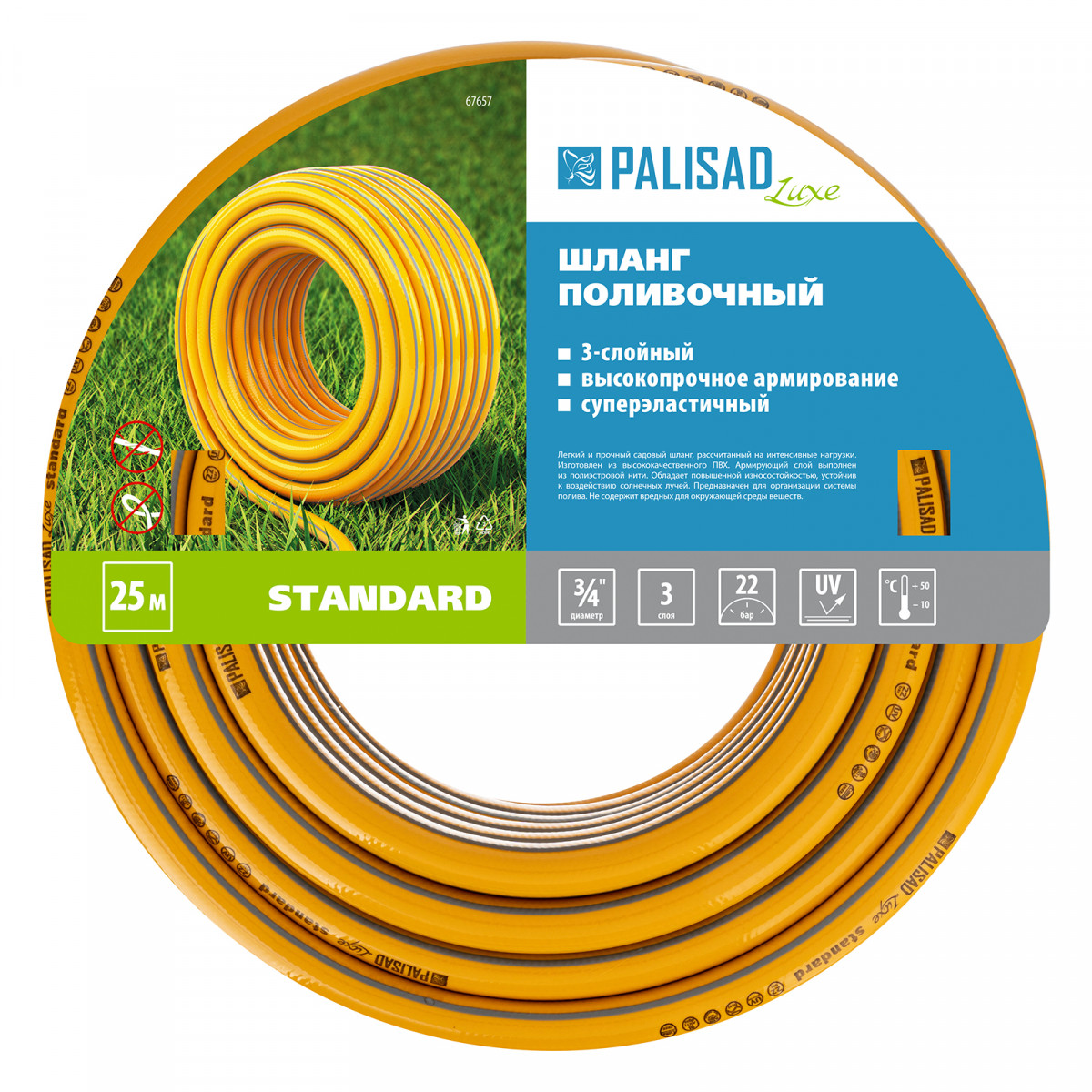 Шланг поливочный армированный 3-слойный Palisad LUXE «Standard» 67657 диаметром 3/4" и длиной 25 м применяется как для ручного, так и для автоматического орошения газонов и насаждений. Используется в саду, на даче, в небольших парках, позволяет поддерживать жизнедеятельность растений без лишних усилий. Совместим с любыми системами полива Palisad и Palisad LUXE.