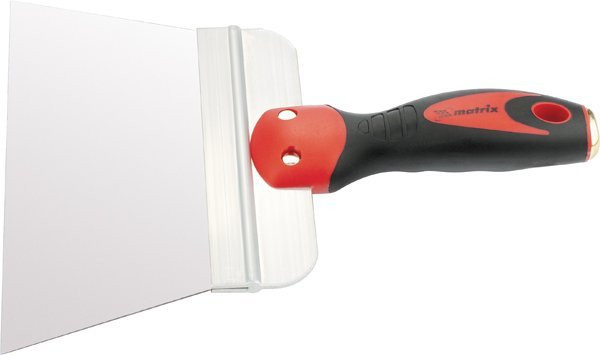 Полотно шпателя изготовлено из нержавеющей стали. Двухкомпонентная (пластик+резина) ручка не проскальзывает в руке. Ручка шпателя имеет специальную (изогнутую) форму, что обеспечивает максимально удобную работу. Шпатель предназначен для нанесения шпатлевок и штукатурных растворов при выравнивании больших поверхностей.