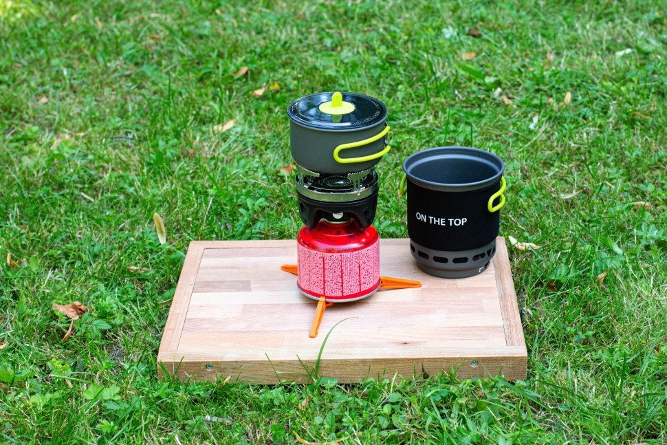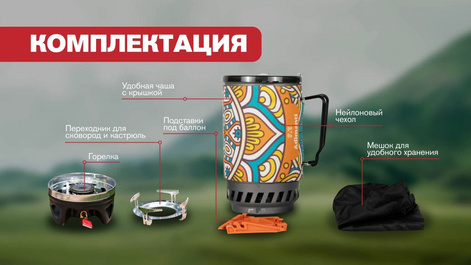 Система приготовления пищи, которая будет кстати в походах, кемпинге и при другом активном отдыхе. Включает в себя чашу, сковороду, газовую плиту, переходник для посуды, крышку, подставку для газовых баллонов.