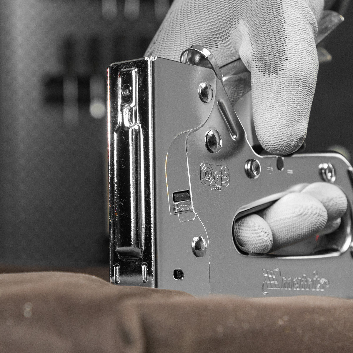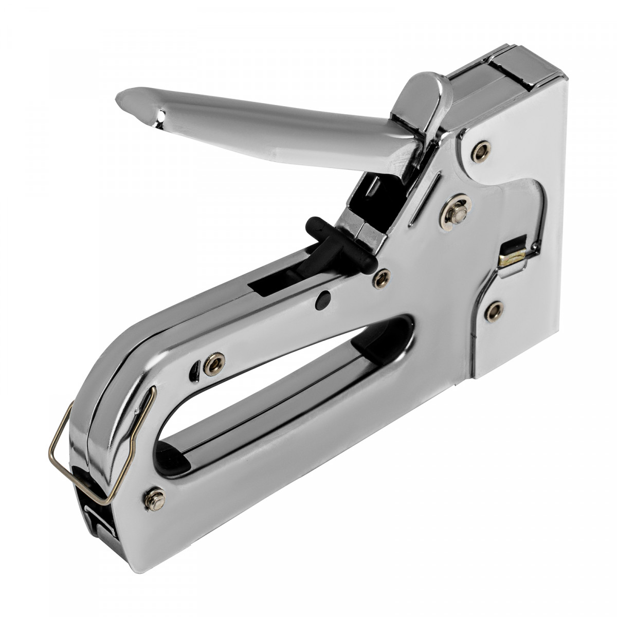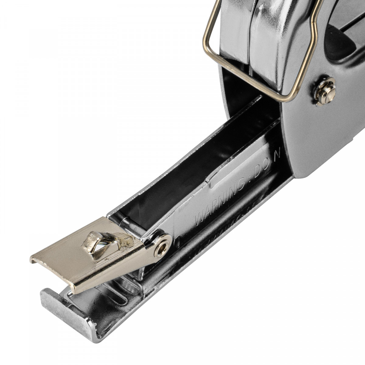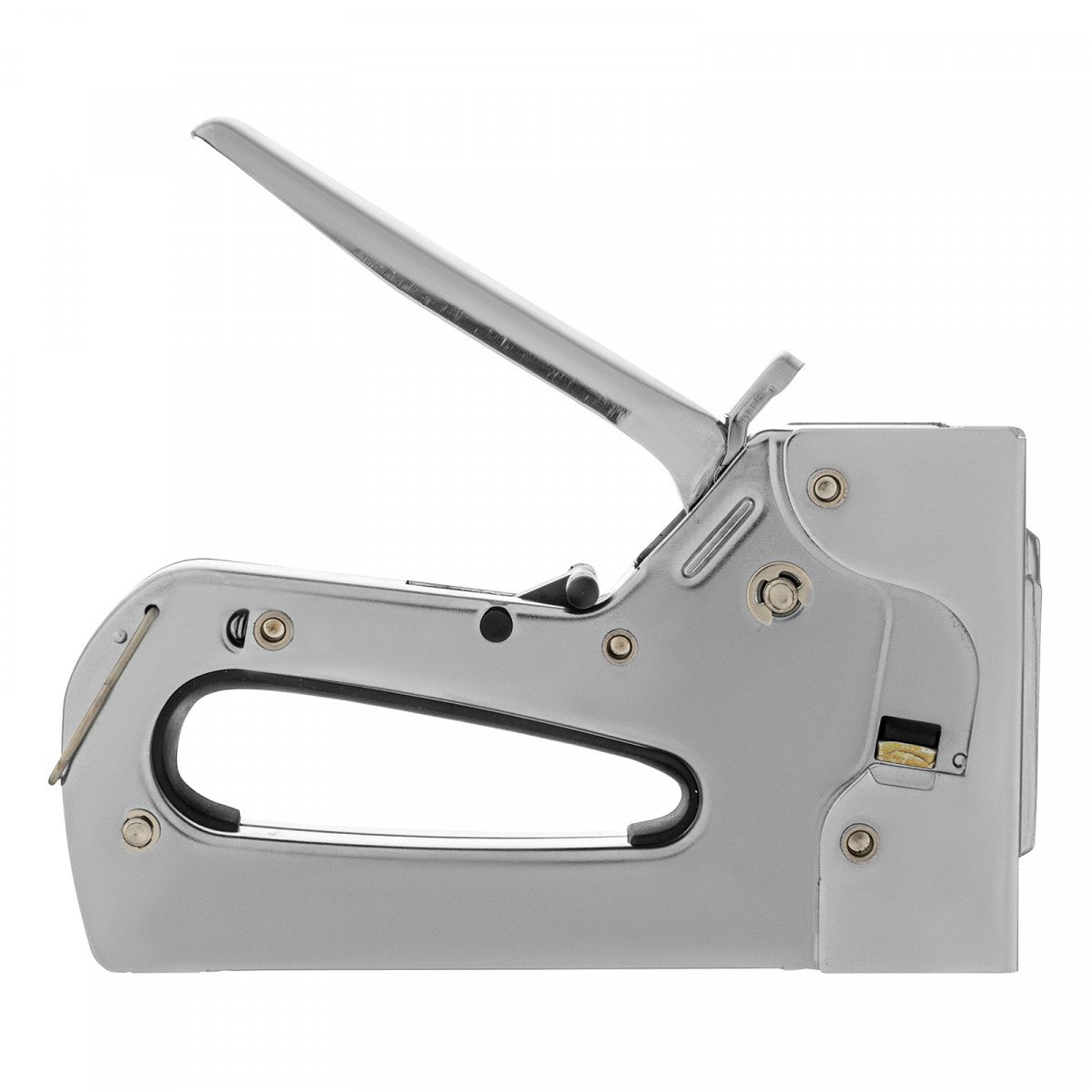 - Безопасное хранение и транспортировка — скоба-фиксатор удерживает рукоятку в нерабочем положении, исключая случайное срабатывание степлера.