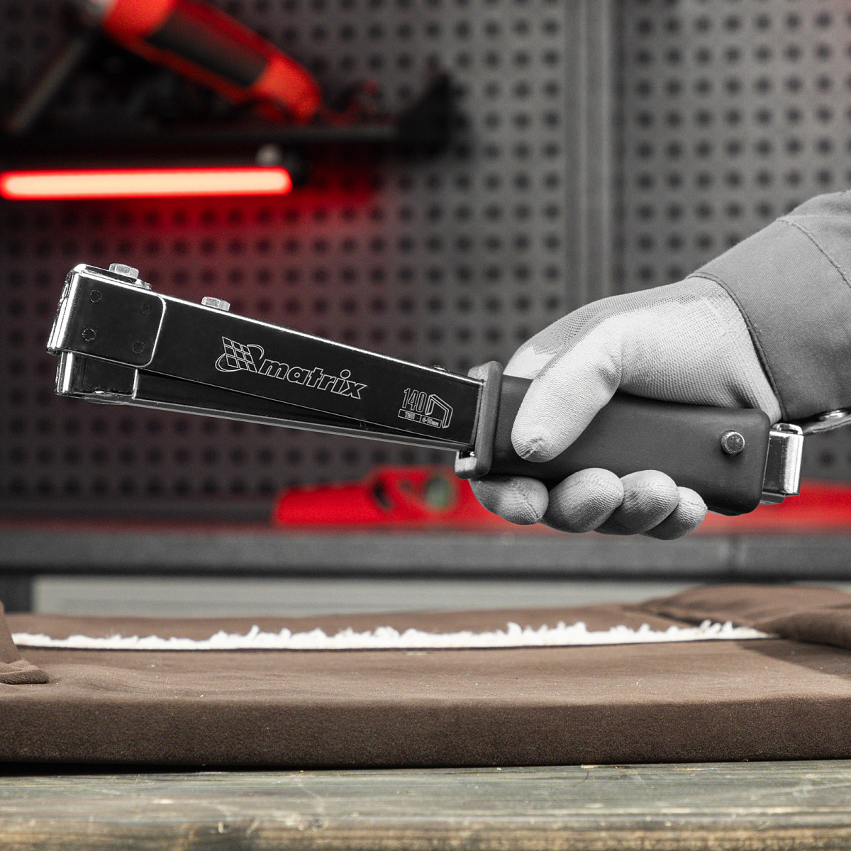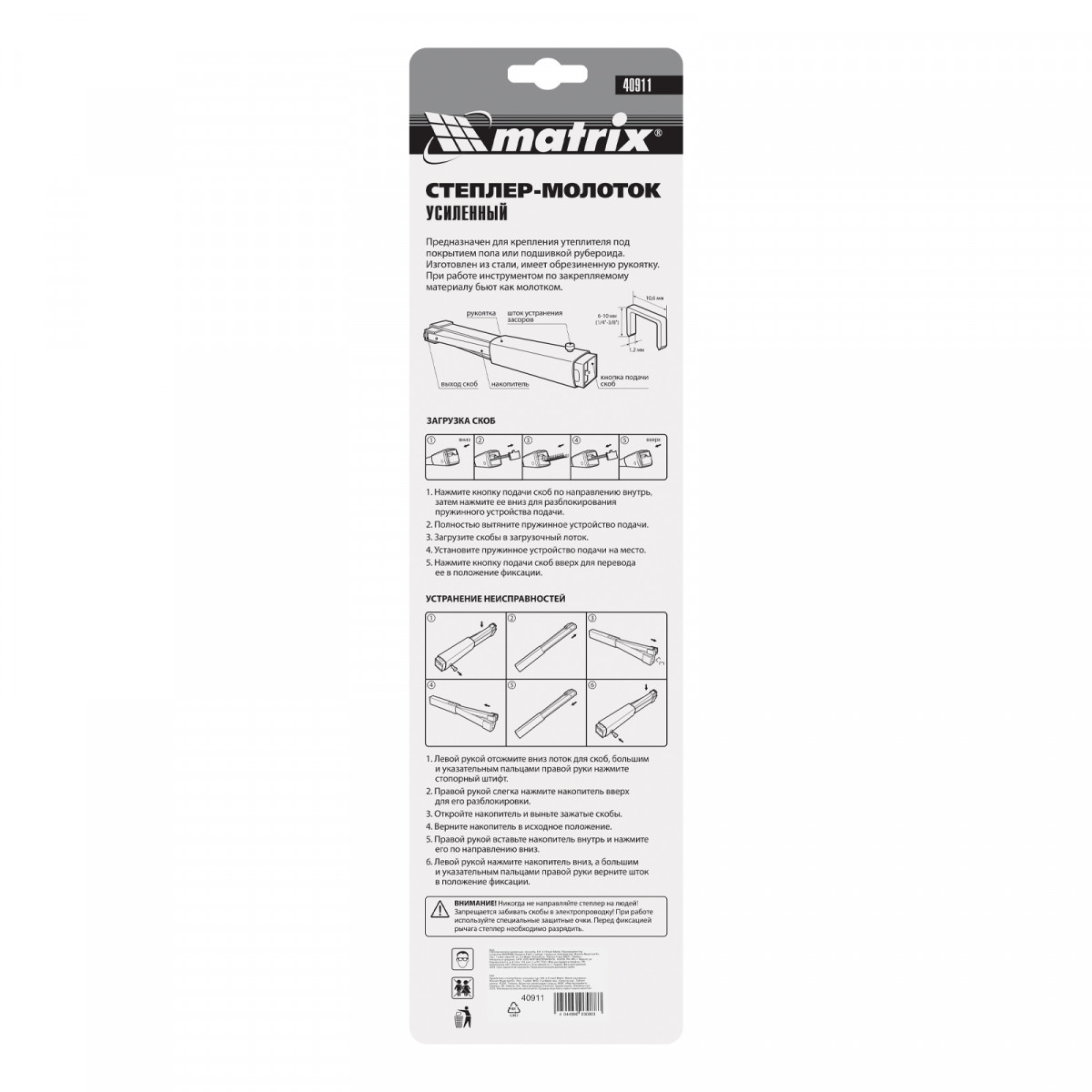 Усиленный степлер-молоток Matrix 40911 работает со скобами типа 140 размером 6-10 мм, оптимальными для крепления тонких листовых материалов и тканей. Используется для укладки кровельных и изоляционных материалов, а также ковровых покрытий. Применение степлера-молотка позволяет значительно ускорить выполнение строительных и отделочных работ.