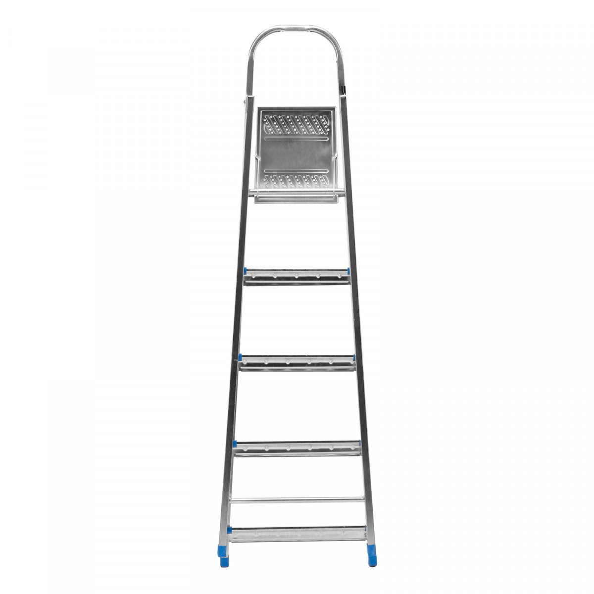 Стальная оцинкованная стремянка Сибртех 97837 с 5 ступенями позволяет повесить полку, картину или шкафчик, достать нужный предмет и решить другие задачи, для которых требуется доступ к предметам на высоте. Рама и ступени из стального профиля выдерживают вес до 120 кг. Расстояние от опорной поверхности до площадки составляет 99 см, при среднем росте пользователя 170 см рабочая высота лестницы — 299 см. Необходимо соблюдать технику безопасности: размещать стремянку только на ровной плоскости и не использовать ее для работы с дрелью, шуруповертом и другим электроинструментом.