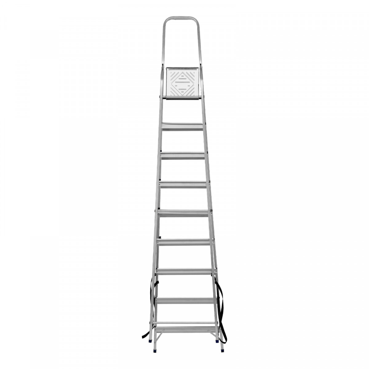- Продуманная конструкция — стальная рабочая площадка с зацепами надежно фиксирует стремянку в разложенном положении.