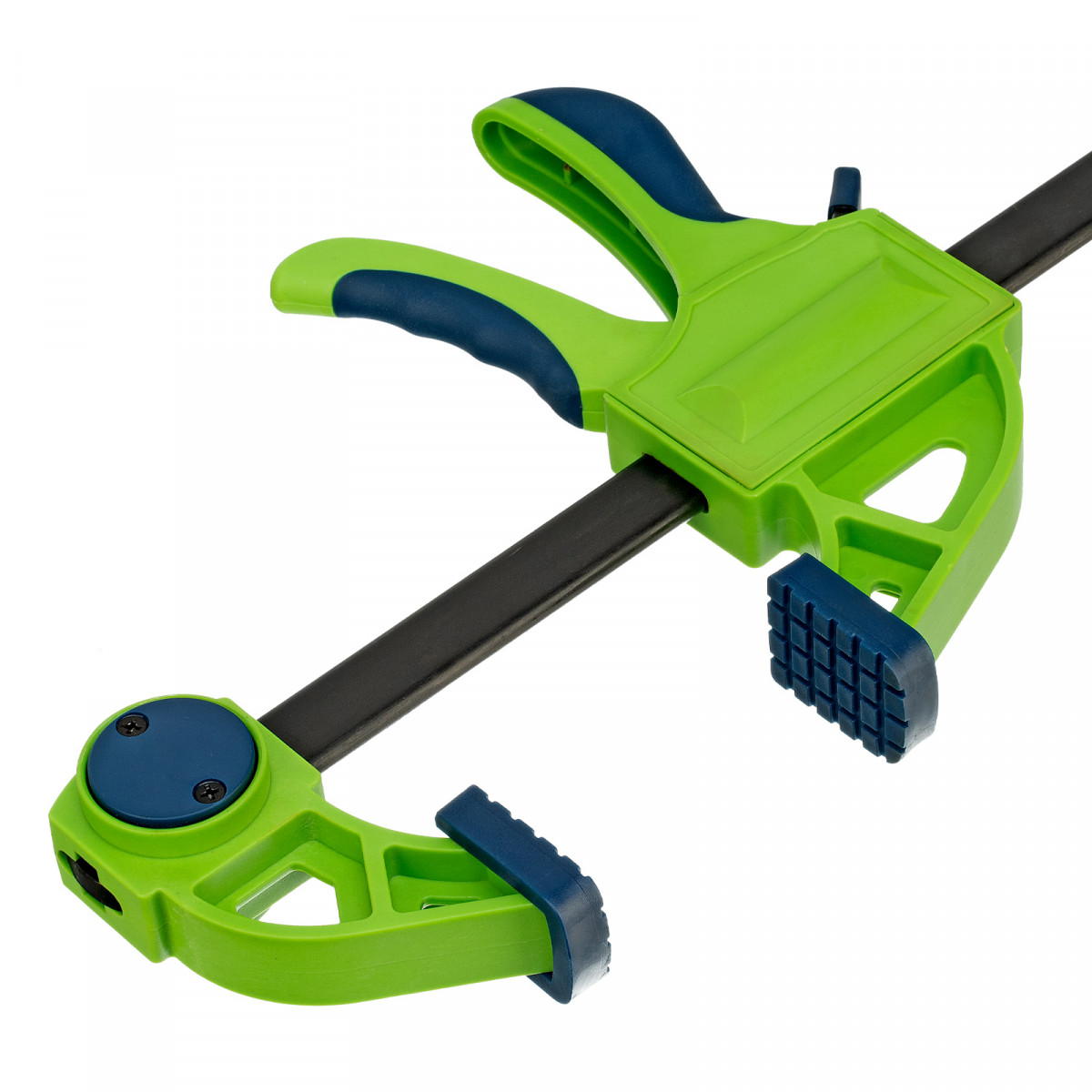 F-образная быстрозажимная струбцина Сибртех 20565 длиной 540 мм, с шириной и глубиной зажима 300 и 70 мм соответственно, в пластиковом корпусе, с фиксатором и двухкомпонентной рукояткой, позволяет зажимать заготовки для их дальнейшей обработки или сборки. Помогает решать множество задач благодаря оптимальной глубине зажима. Пластинчатый механизм пошагово перемещает подвижную губку вдоль направляющей до достижения максимально плотного захвата детали. Фиксатор препятствует движению губки в обратную сторону. Струбцина пригодится в столярной мастерской, а также будет полезна в быту.