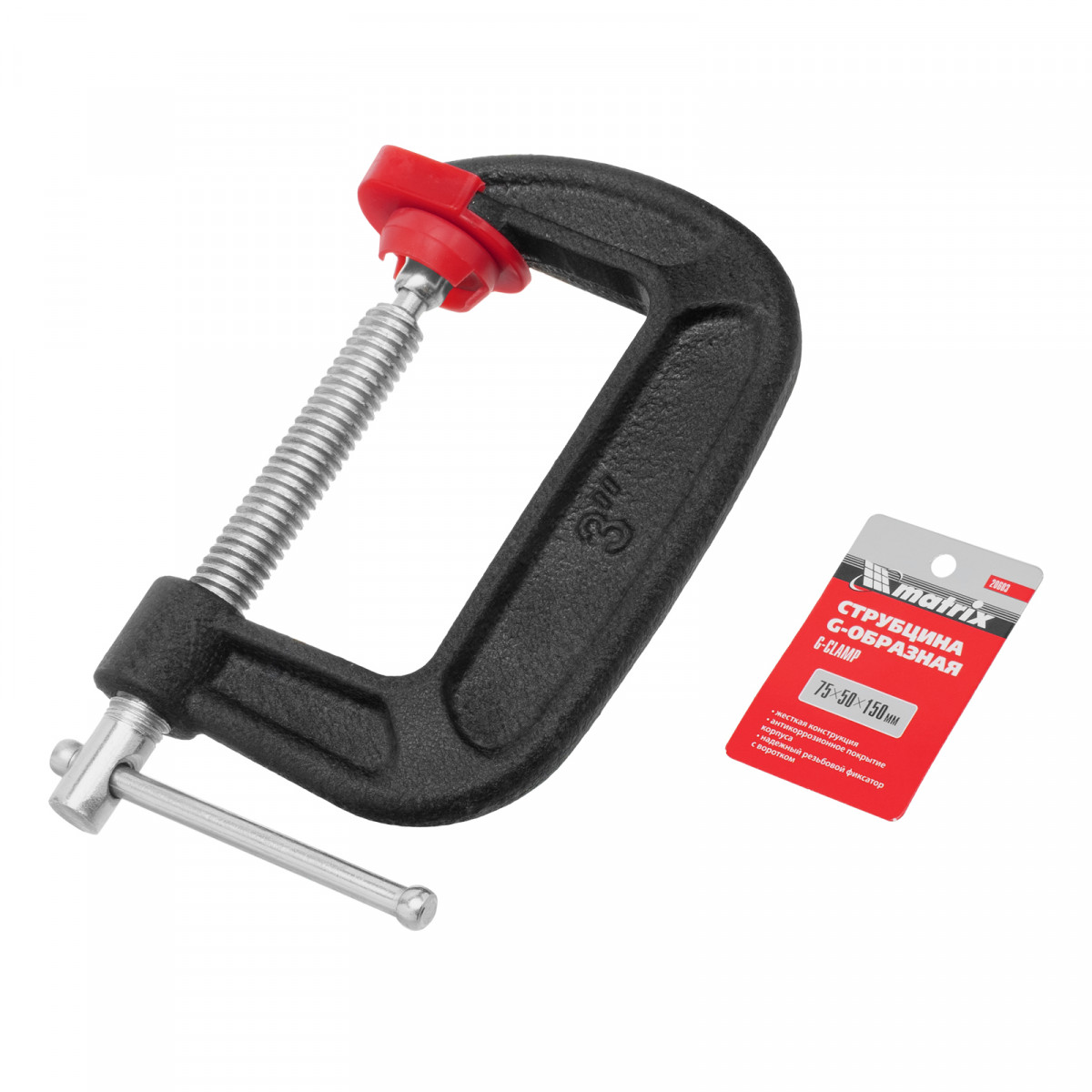 Струбцина G-образная Matrix 20603 с максимальной шириной зажима 75 мм используется для фиксации заготовок или закрепления их на верстаке или станке. Позволяет склеивать детали, а также сверлить их, шлифовать, опиливать и проводить другие работы. Подходит для использования во время сварки. Стальной винт и рама из высокопрочного чугуна выдерживают значительные нагрузки. Винт с трапециевидной резьбой обеспечивает надежную фиксацию предметов. Струбцина применяется в слесарном и столярном деле, а также в домашнем хозяйстве.