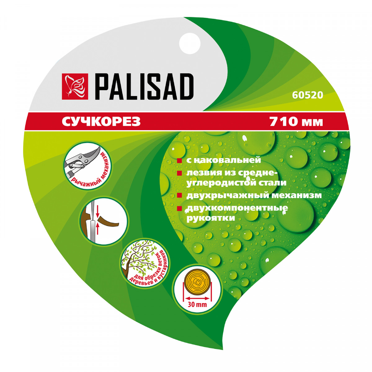 Сучкорез с наковальней Palisad 60520 длиной 710 мм, с двухрычажным механизмом и двухкомпонентными рукоятками, — двуручный инструмент для обрезки засохших и увядших веток диаметром до 30 мм. Двухрычажный механизм увеличивает прикладываемое усилие на 20%, что облегчает работу. Регулировочный винт позволяет контролировать плотность смыкания лезвий. Сучкорез будет полезен на дачном участке.