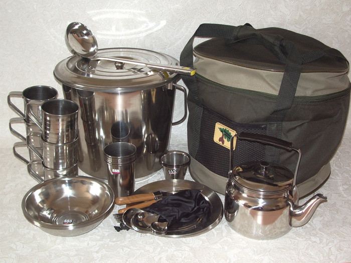 Комплектация: - Кружка – 6 шт. - Стакан – 6 шт. - Стопка – 6 шт. - Миска глубокая – 6 шт. - Тарелка – 6 шт. - Вилка – 6 шт. - Ложка столовая – 6 шт. - Ложка чайная – 6 шт. - Нож – 1 шт. - Ведро с крышкой – 1 шт. - Половник – 1 шт. - Чайник – 1 шт.