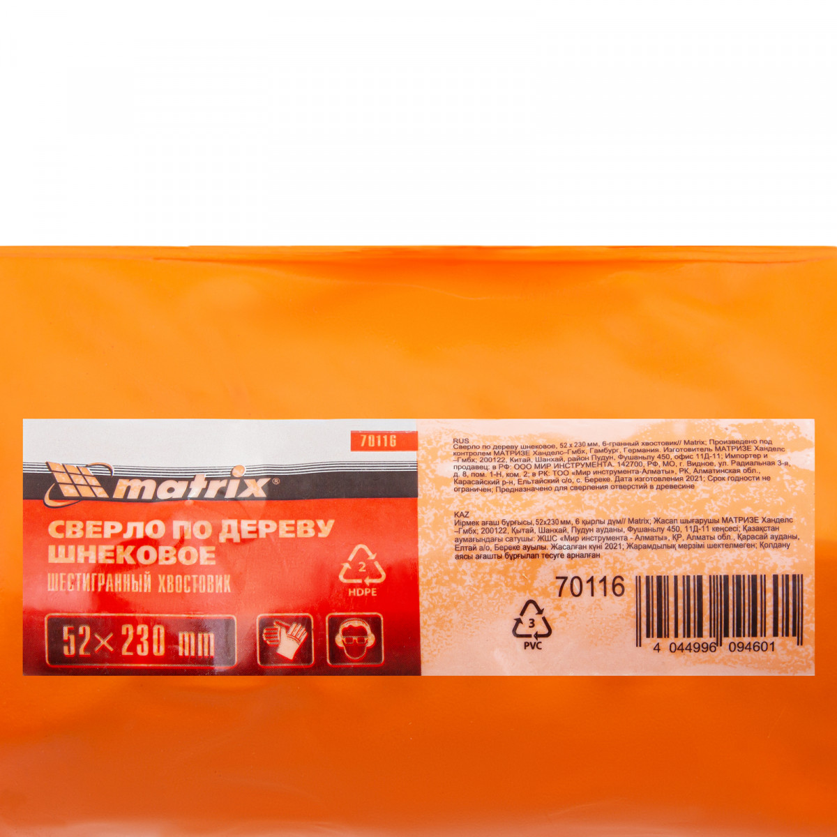 Сверло по дереву шнековое, 52 х 230 мм, шестигранный хвостовик Matrix