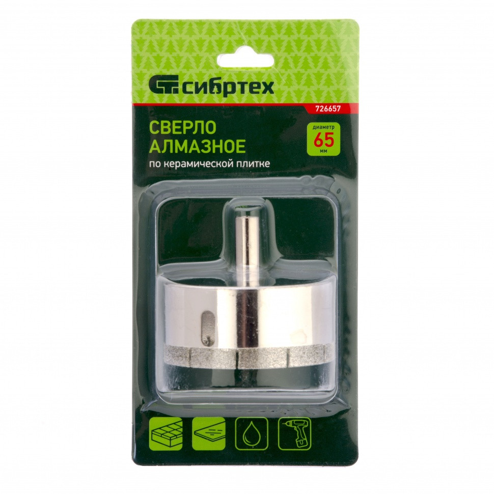 Сверло Сибртех 726657 размером 65 х 55 мм, с цилиндрическим хвостовиком, используется для получения ровных отверстий без сколов в стекле и керамической плитке. Устанавливается в патрон дрели или шуруповерта, работающих в диапазоне 350-700 об/мин. Во время работы рекомендуется применять водяное охлаждение — это существенно увеличит ресурс оснастки. Использование кондуктора (арт. 72830) позволяет точно позиционировать сверло и облегчает засверливание. Оснастка подходит для выполнения работ небольшого объема и рекомендована для использования в быту.