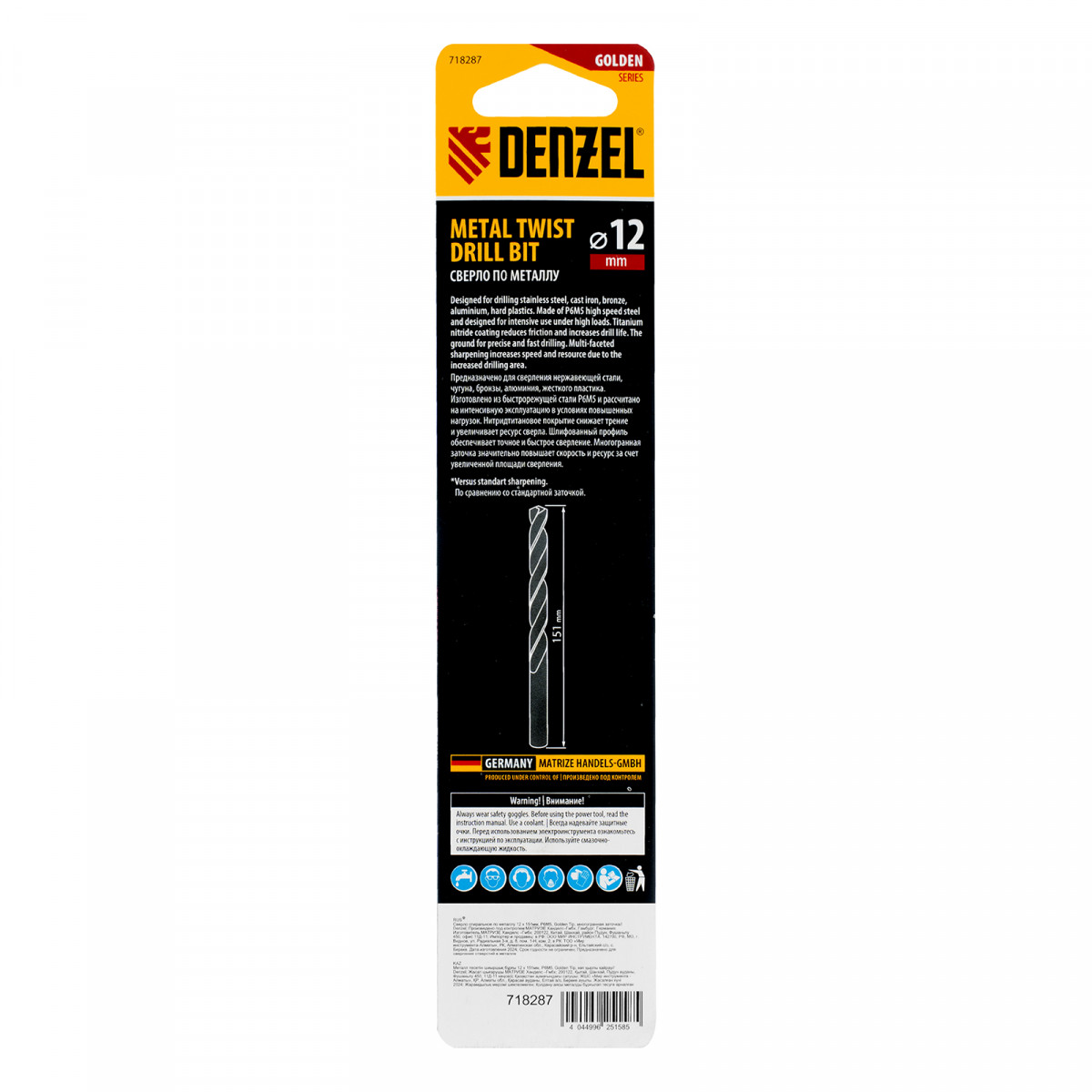 Сверло спиральное по металлу 12 x 151мм, Р6М5, Golden Tip, многогранная заточка Denzel