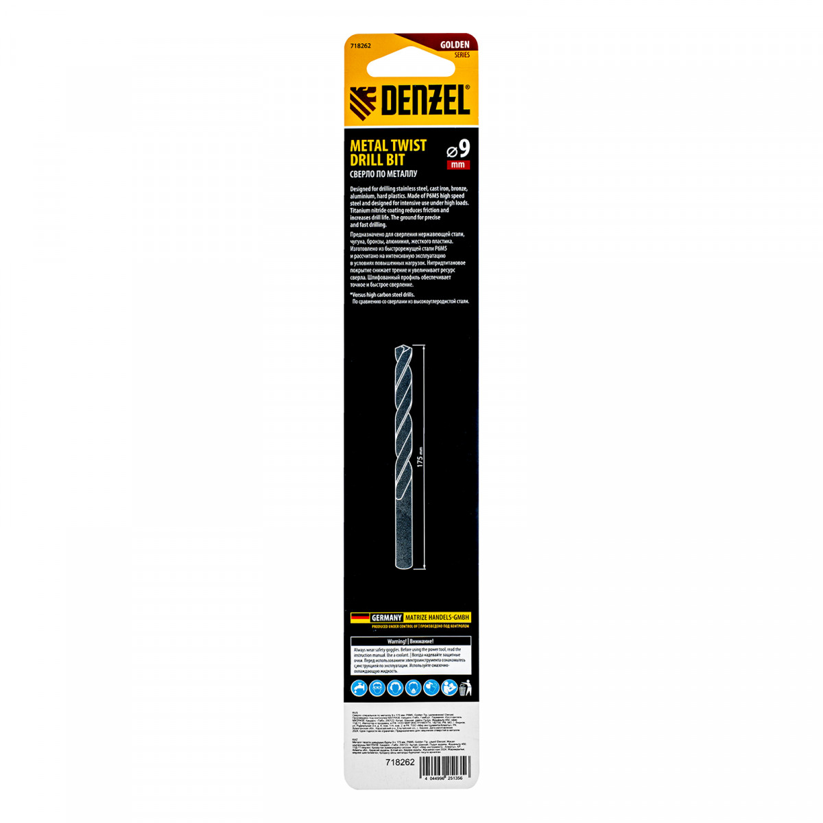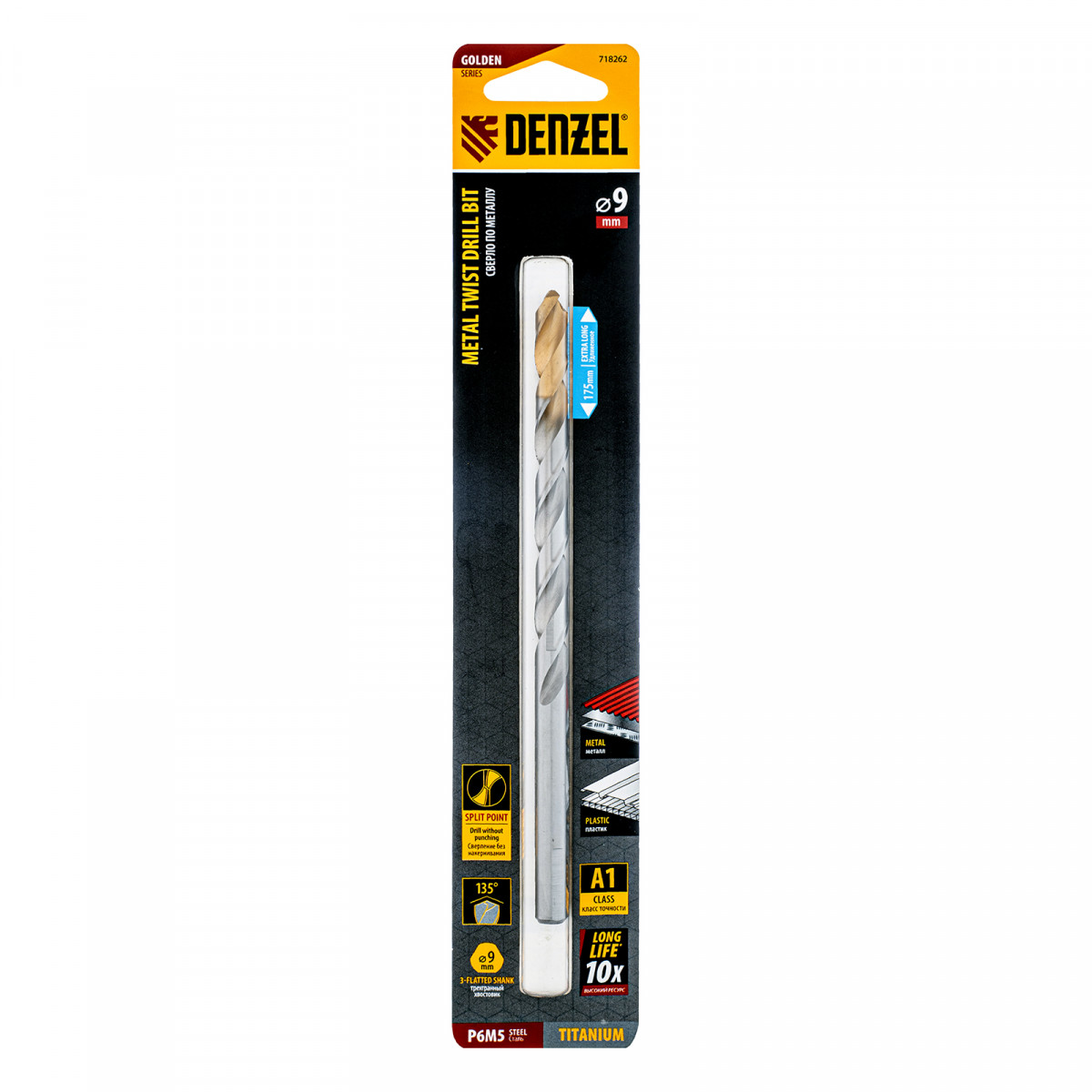 Сверло спиральное по металлу 9 х 175 мм, Р6М5, Golden Tip, удлиненное Denzel