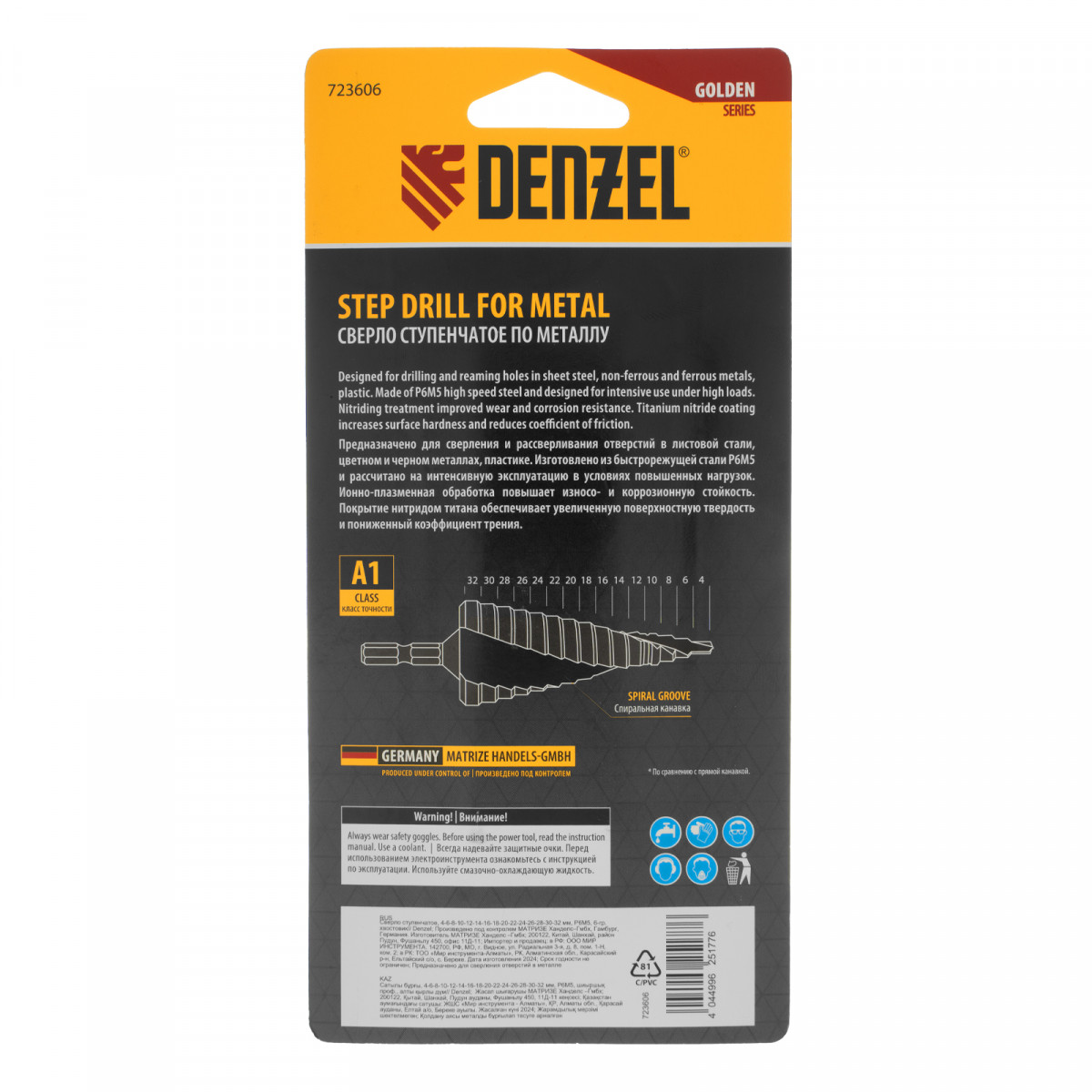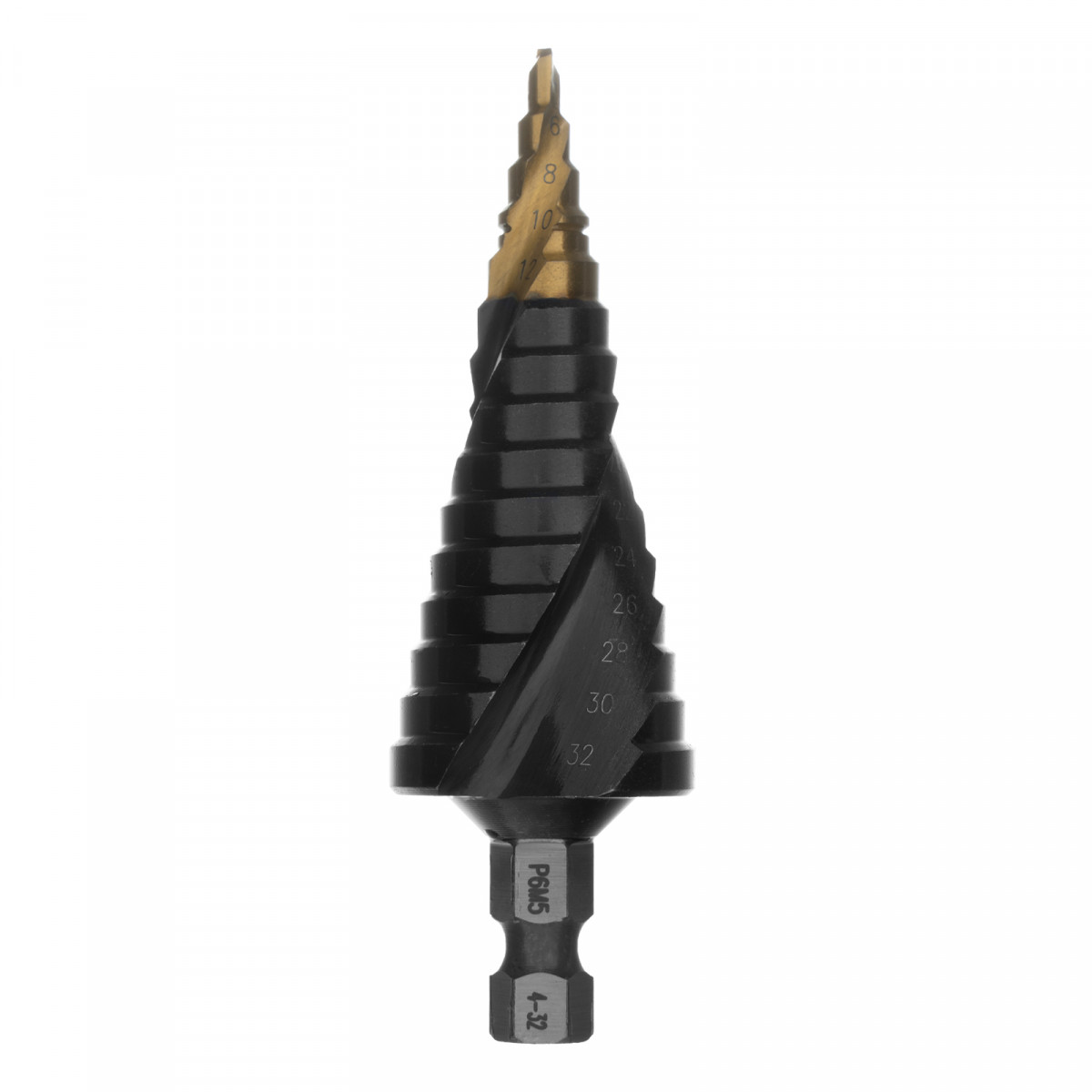 Сверло ступенчатое, 4-6-8-10-12-14-16-18-20-22-24-26-28-30-32 мм, Р6М5, 6-гр. хвостовик Denzel