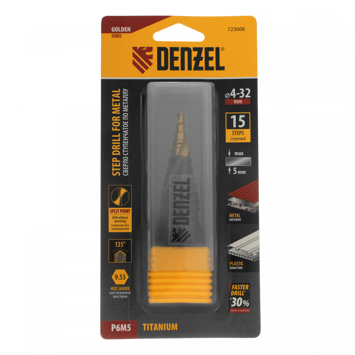 Ступенчатое сверло Denzel 723606 из стали P6M5, с 6-гранным хвостовиком, предназначено для сверления отверстий диаметром от 4 до 32 мм в сталях, цветных металлах и пластике. Избавляет от необходимости иметь при себе целый набор традиционных сверл. Позволяет получать отверстия с ровными краями и уже снятой фаской под гайку или болт. Оснастке присвоен класс точности A1. Сверло пригодится дома и в мастерской.