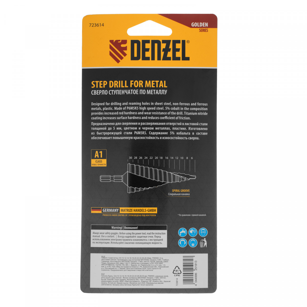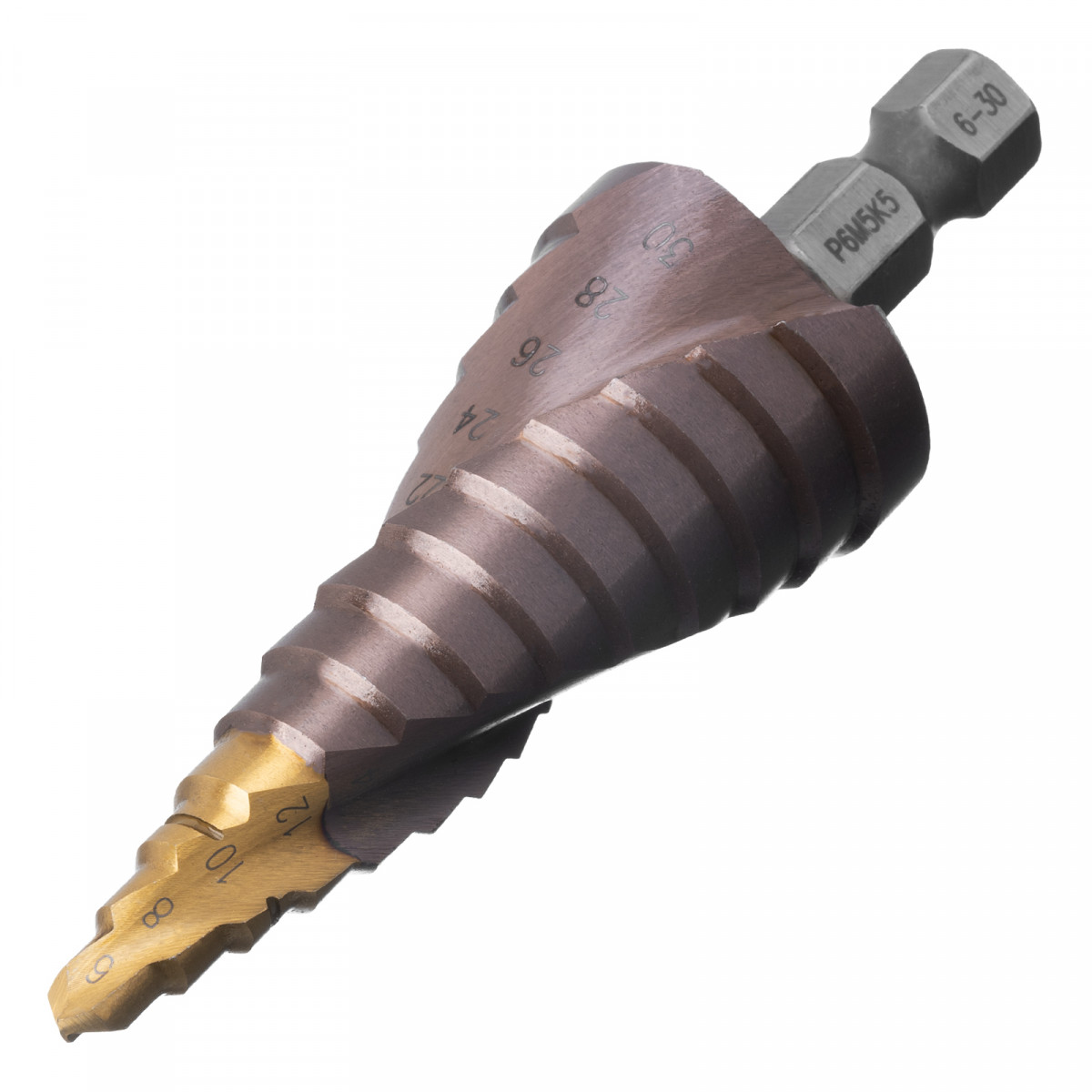 Сверло ступенчатое, 6-8-10-12-14-16-18-20-22-24-26-28-30мм, Р6М5К5, 6-гр. хвостовик Denzel