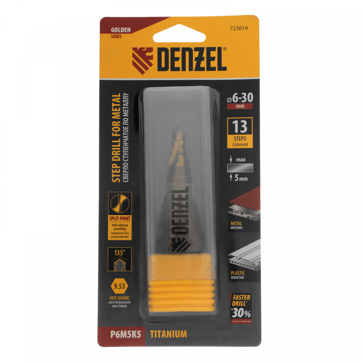 Ступенчатое сверло Denzel 723614 из стали P6M5K5, с 6-гранным хвостовиком, предназначено для сверления отверстий диаметром от 6 до 30 мм в сталях, цветных металлах и пластике. Избавляет от необходимости иметь при себе целый набор традиционных сверл. Позволяет получать отверстия с ровными краями и уже снятой фаской под гайку или болт. Оснастке присвоен класс точности A1. Сверло пригодится дома и в мастерской.