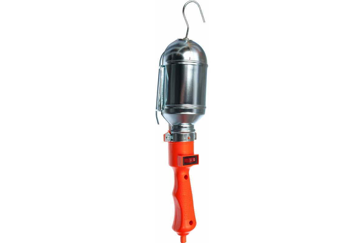 Переносной светильник служит для освещения пространства на удалении от стационарной розетки. Корпус оранжевого цвета изготовлен из пластика, обеспечивая тем самым дополнительную безопасность от поражения электрическим током. Металлический отражатель имеет антикоррозийное покрытие и снабжен защитной сеткой. Выключатель расположен на корпусе, что облегчает использование. Длина провода - 10 метров. Крюк для подвеса позволяет освободить руки для работы. Цоколь Е27 подходит для любого типа ламп (мощность лампы накаливания не выше 60Вт). Изделие пригодится для работы в гараже или мастерской.