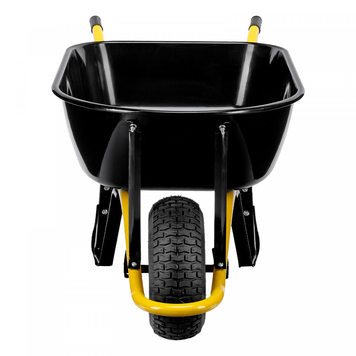 • Устойчивость — тачка не проваливается в грунт благодаря широкому пневмоколесу и подпятникам на ножках.
