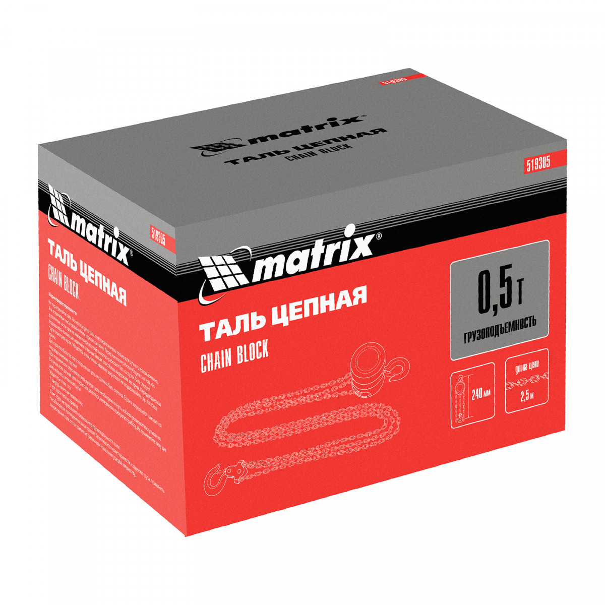 Цепная таль Matrix 519305 с расстоянием между крюками 240 мм позволяет поднимать грузы весом не более 0,5 т на высоту до 2,5 м. Простая конструкция облегчает использование. Механизм пригодится для проведения погрузочно-разгрузочных, ремонтных, монтажных работ.