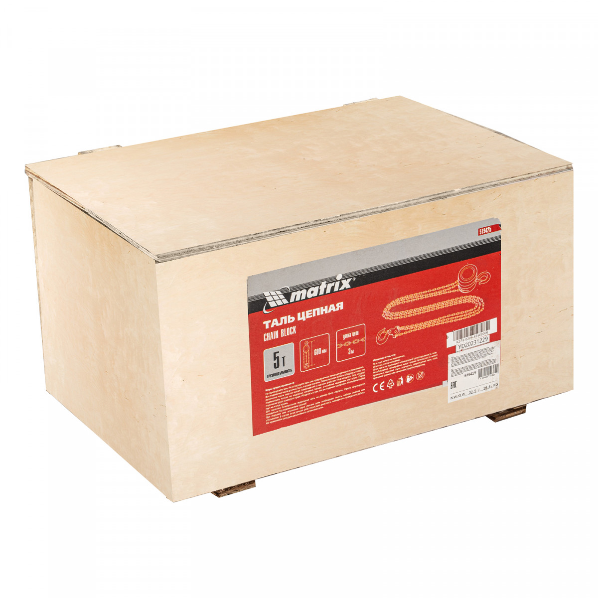 Таль цепная, 5 т, H подъема 3 м, расстояние между крюками 600 мм Matrix